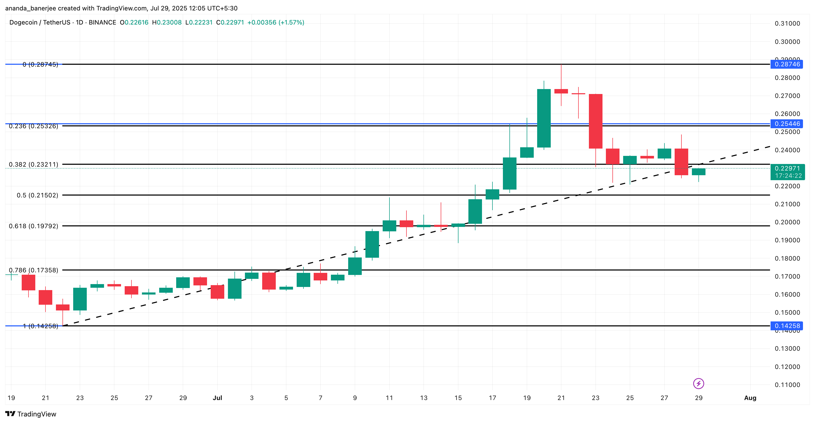 Dogecoin наразі торгується трохи нижче $0,23, коливаючись між ключовими рівнями Фібоначчі; $0,23 (0,382 корекція) та $0,21 (0,5 корекція). Щоб наратив про бичачу дивергенцію повністю реалізувався, ціна повинна утриматися вище $0,21 та повернути $0,25.