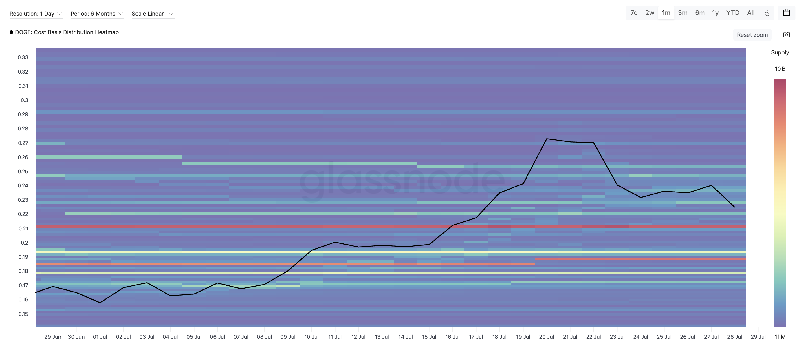 Теплова карта собівартості DOGE, яка відображає кластери гаманців за середньою ціною придбання, показує масивну смугу пропозиції біля $0,21. Більше 9,77 мільярдів DOGE знаходяться в цьому діапазоні, що свідчить про те, що багато утримувачів купили на цьому рівні і, ймовірно, будуть його захищати. Історично ці зони виступають як підлога підтримки ціни Dogecoin під час корекцій.