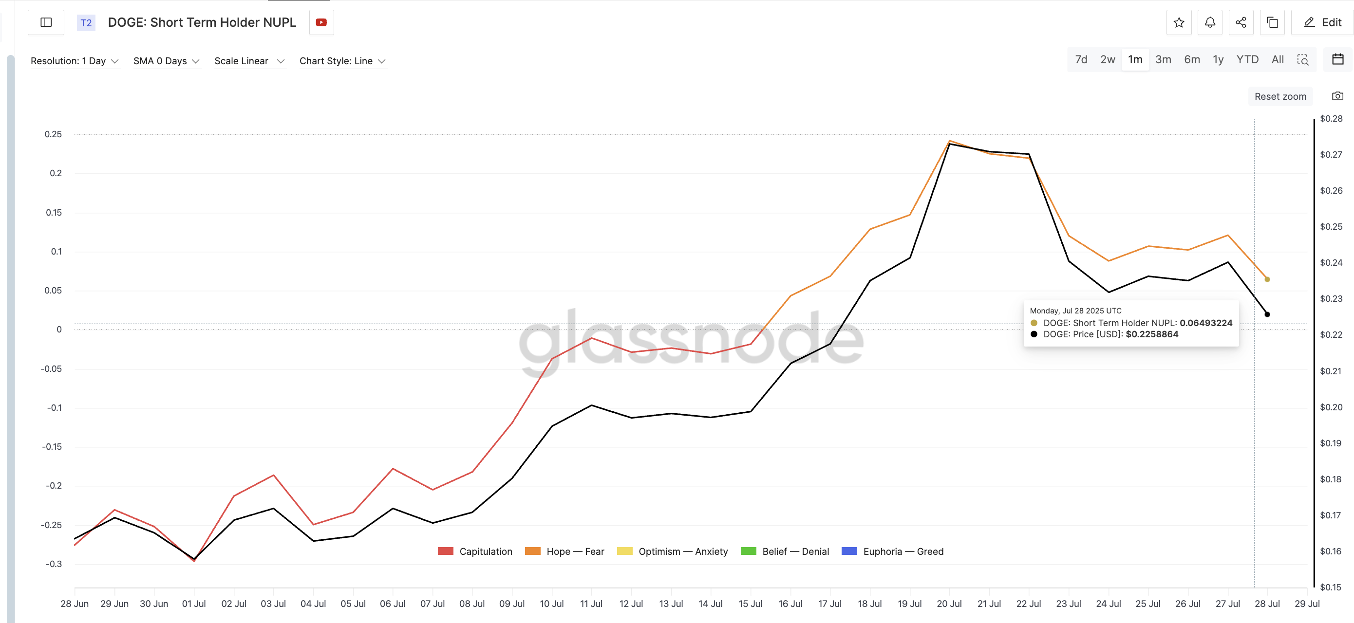 Перший знак зміни настроїв походить від показника Net Unrealized Profit/Loss (NUPL) короткострокових утримувачів. Цей індикатор відстежує нереалізовані прибутки та збитки гаманців, які придбали DOGE протягом останніх 155 днів; зазвичай це найбільш реактивні учасники ринку.