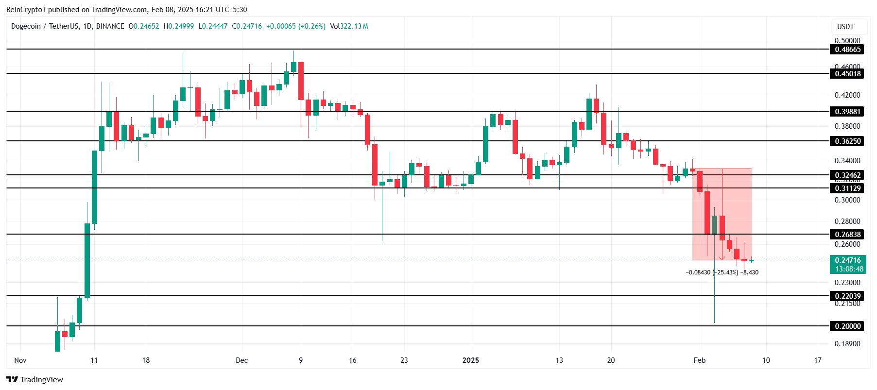 Dogecoin торгується за 0,248 доларів, що означає падіння на 25% за останній тиждень. Якщо ведмежий тиск продовжиться, ціна може знизитися далі до 0,220 доларів, продовжуючи недавні втрати.