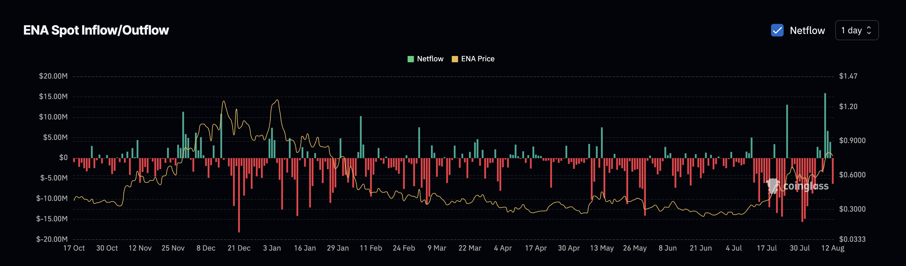 Тиск продажів з того часу зменшився. Чисті потоки тепер знову стали негативними на момент написання, що є ознакою того, що більше ENA залишає біржі, ніж надходить, що свідчить про повернення до накопичення.