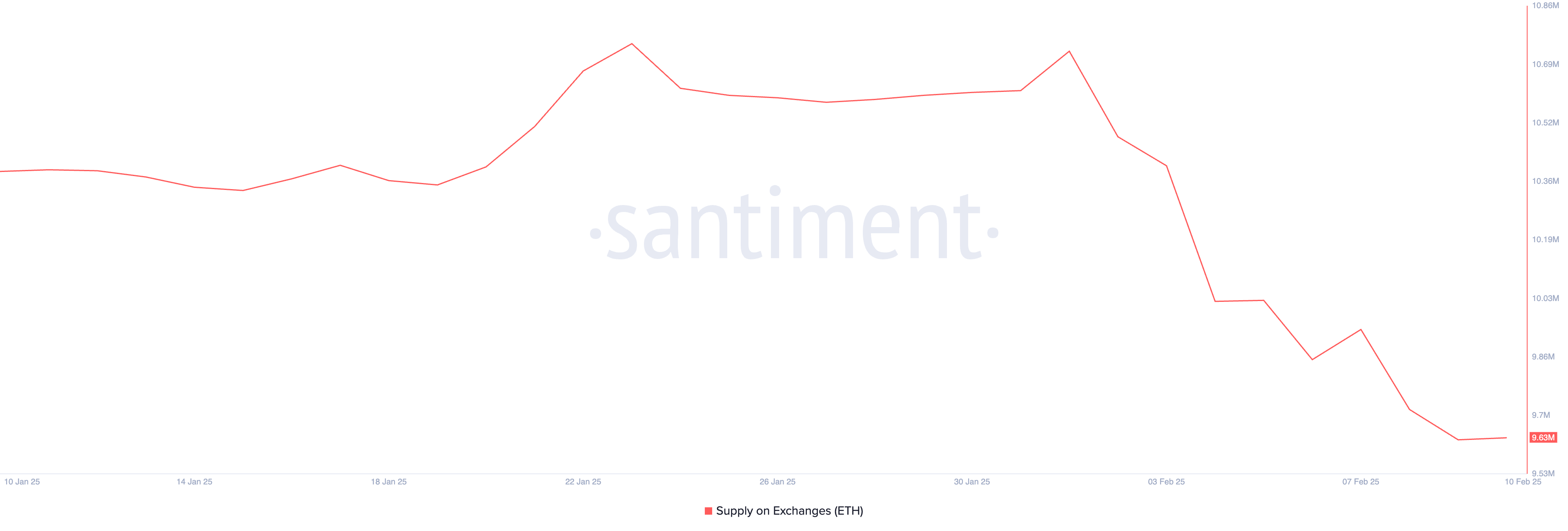 Обсяг ETH на біржах зазнав значних змін за останні кілька тижнів. Після зростання з 10,35 мільйона 19 січня до 10,73 мільйона 1 лютого, баланси на біржах різко знизилися, впавши до 9,63 мільйона – найнижчого рівня за шість місяців, починаючи з серпня 2024 року.