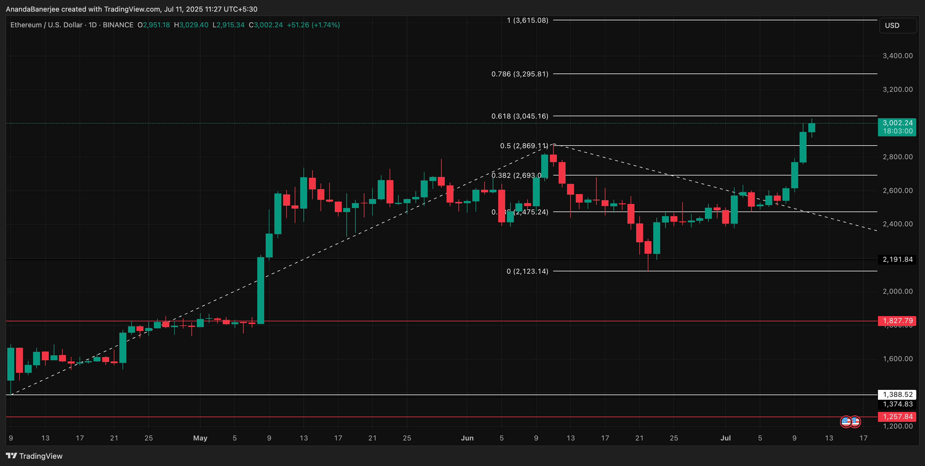 Нещодавній прорив Ethereum вище 3 000 доларів підводить його до ключової зони опору; 0,618 розширення Фібоначчі, намальоване з використанням рівнів на основі тренду від мінімуму 1 388 доларів, піку 2 869 доларів і мінімуму відкату 2 123 доларів. Це ставить 3 045 доларів як негайний опір, а 3 295 доларів (рівень 0,786 Фібоначчі) як наступну стелю, якщо ралі утримається.
