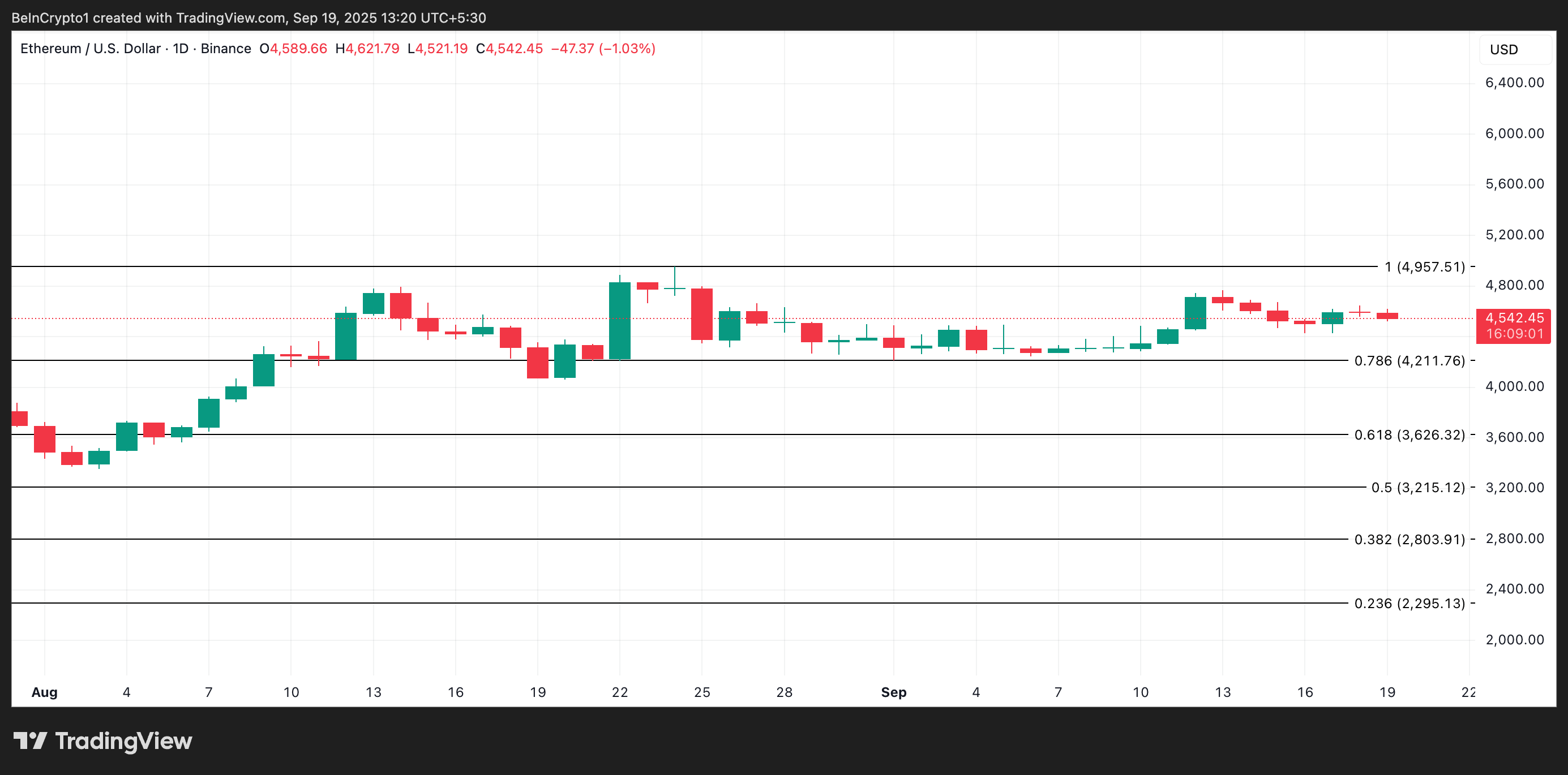 На момент написання цієї статті провідний альткоїн торгується на рівні 4 542 доларів, утримуючись вище підлоги підтримки на рівні 4 211 доларів. Якщо ведмежі настрої зміцняться, а розпродажі продовжаться, монета може знову протестувати цю лінію підтримки.