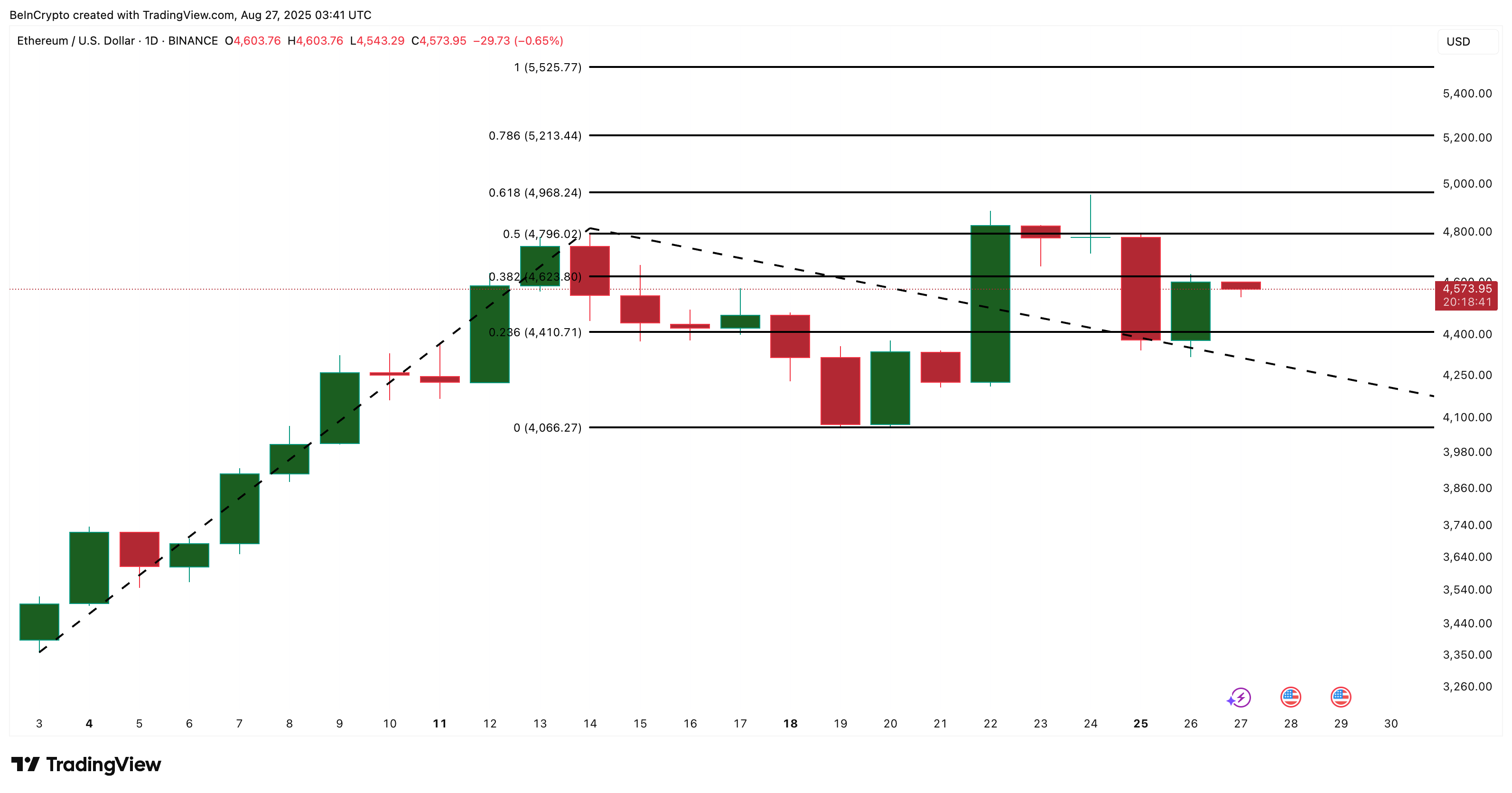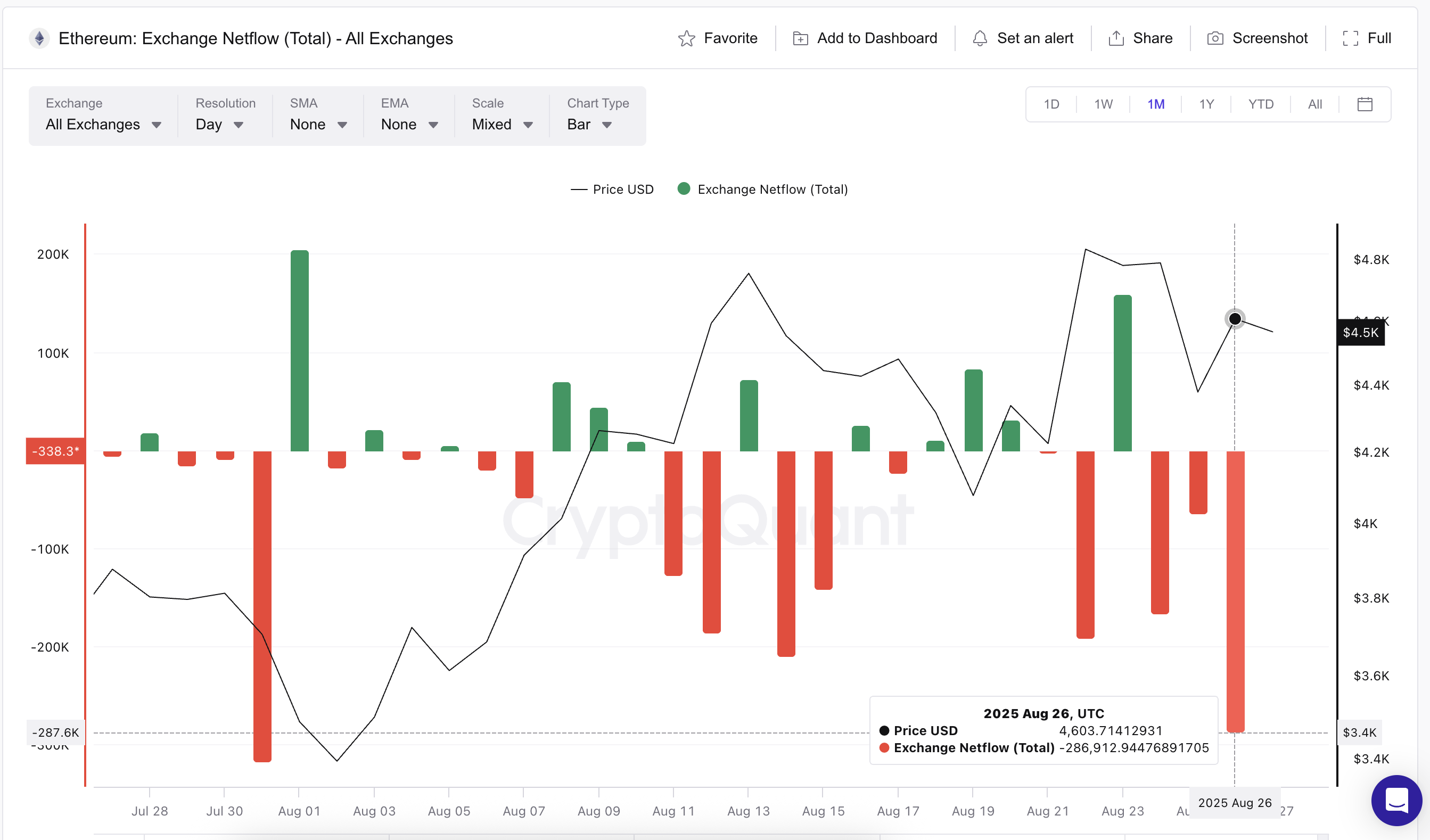 26 серпня відтік валют досяг майже 287 000 ETH. Це стало другим за величиною рівнем з 31 липня, коли за один день вийшло понад 316 000 ETH. Тоді цей крок передував зростанню ціни Ethereum з $3 930 до $4 750 за кілька днів.