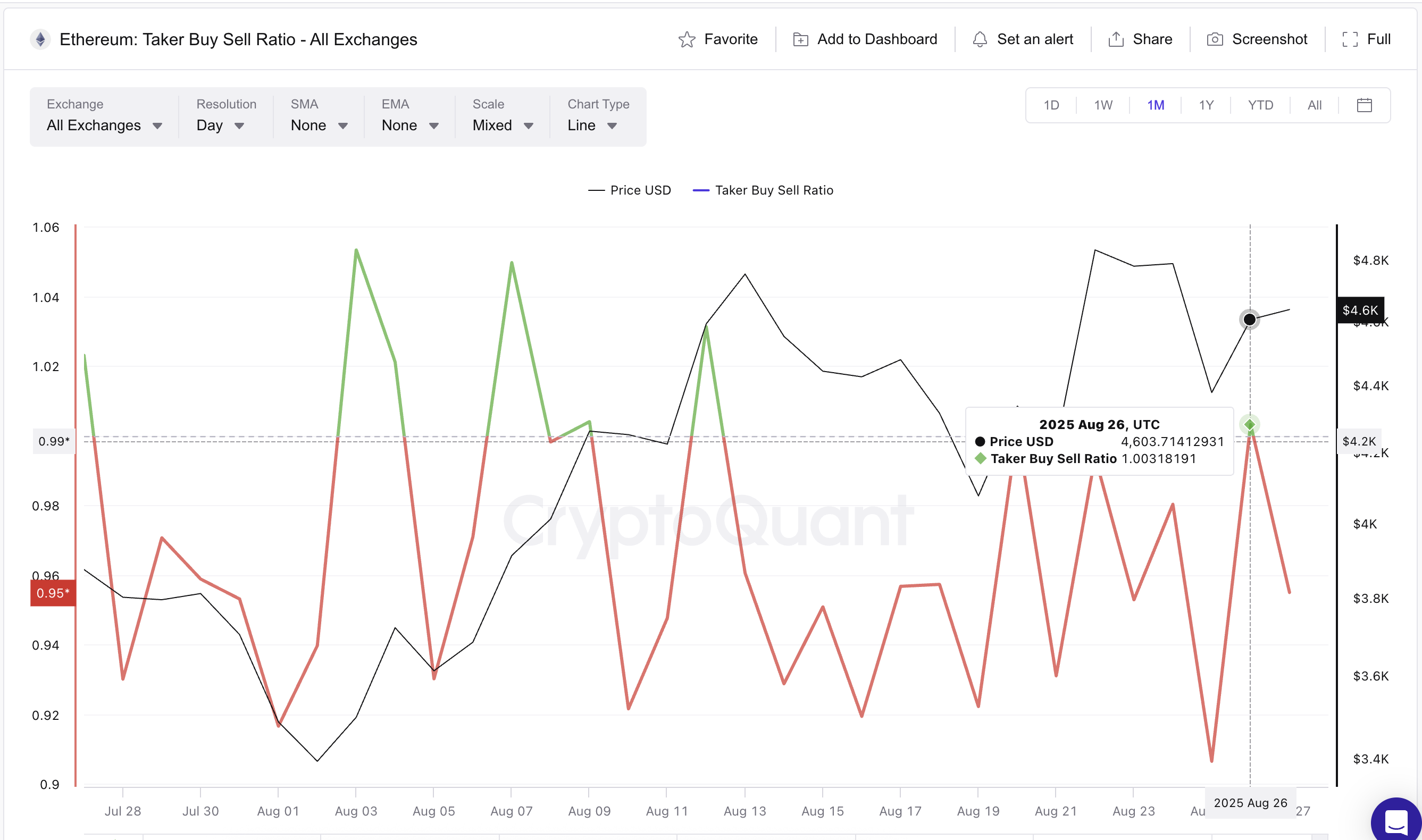 Sponsored26 серпня коефіцієнт ненадовго підскочив вище 1 вперше з 20 серпня. Попередні локальні піки вище 1, такі як 9 серпня та 12 серпня, супроводжувалися сильним ралі цін на Ethereum.