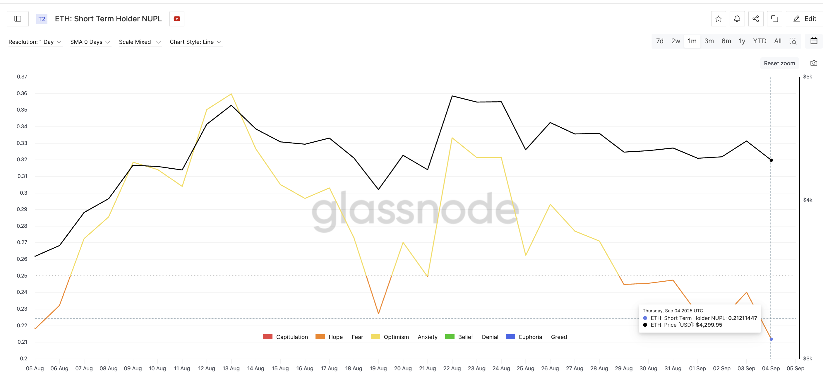 Наприклад, 19 серпня, коли NUPL знаходився близько 0,22, ціна Ethereum становила $4 077. У наступні сесії ETH зріс майже на 20% до $4 829.
