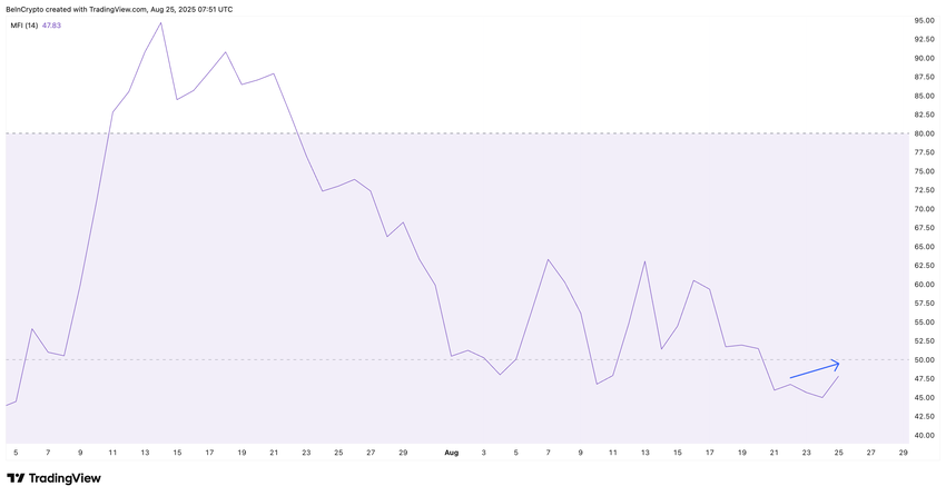 SponsoredПоки що покупці все ще активні. Індекс грошового потоку (MFI), який відстежує вхід капіталу в актив або вихід з нього, зріс з 45 до 47,8, а ціна знизилася.