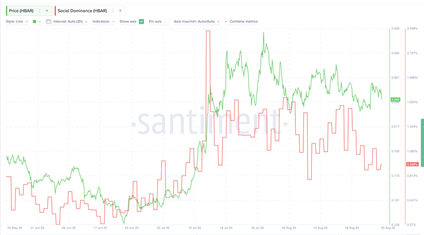Однією з причин обережності є слабка видимість HBAR на ринку. З середини липня соціальне домінування HBAR впало майже на 90%, впавши з максимуму в 2,41% 13 липня до 0,93% зараз. Це різкий спад балаканини та уваги.