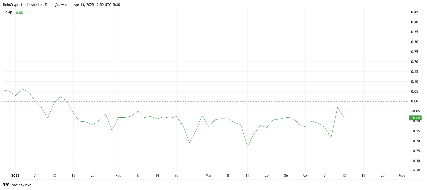 Загальний настрій ринку, індикатор Chaikin Money Flow (CMF) залишається нижче нульової лінії, сигналізуючи про слабкі припливи в HBAR. Цей постійний ведмежий сигнал свідчить про низьку довіру інвесторів до активу. CMF відстежує акумуляцію та розподіл активу, і його поточна позиція вказує на те, що скептицизм домінує на ринку.