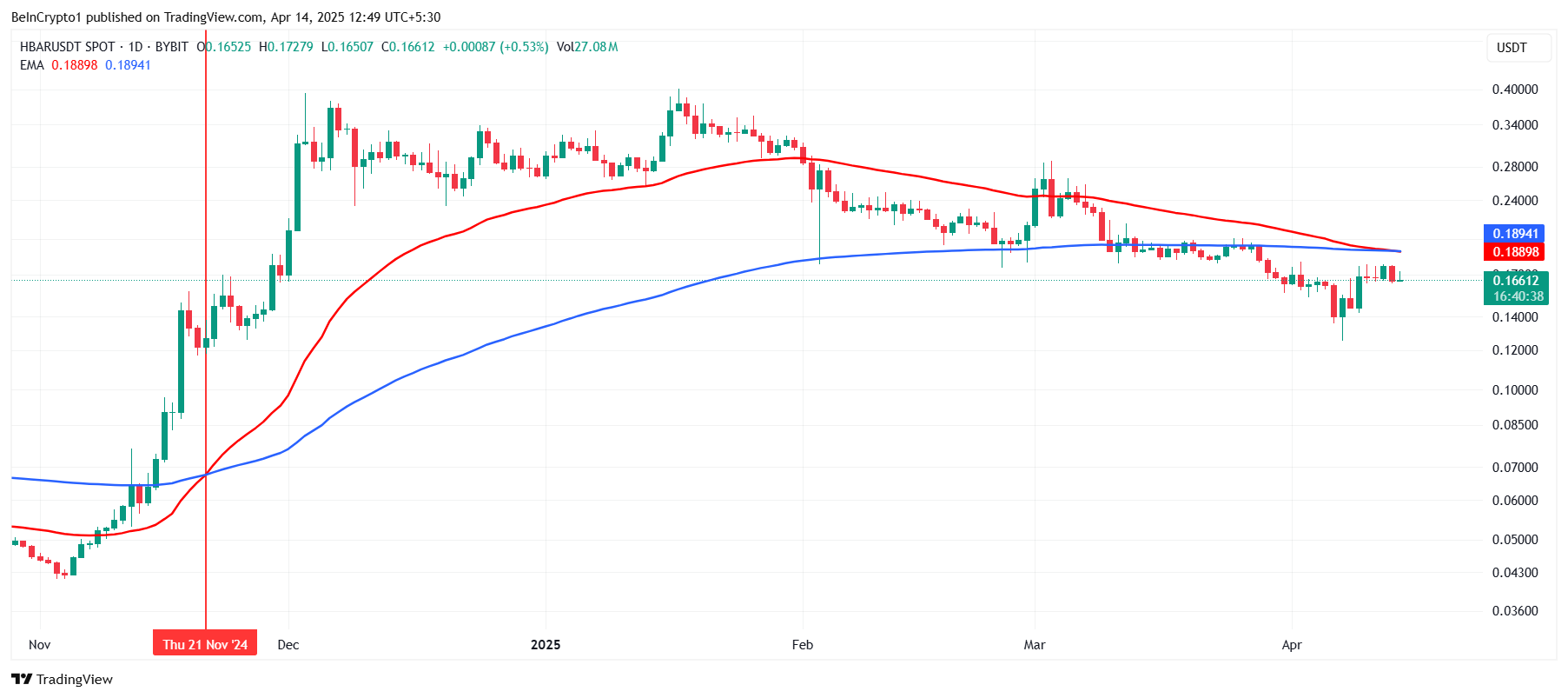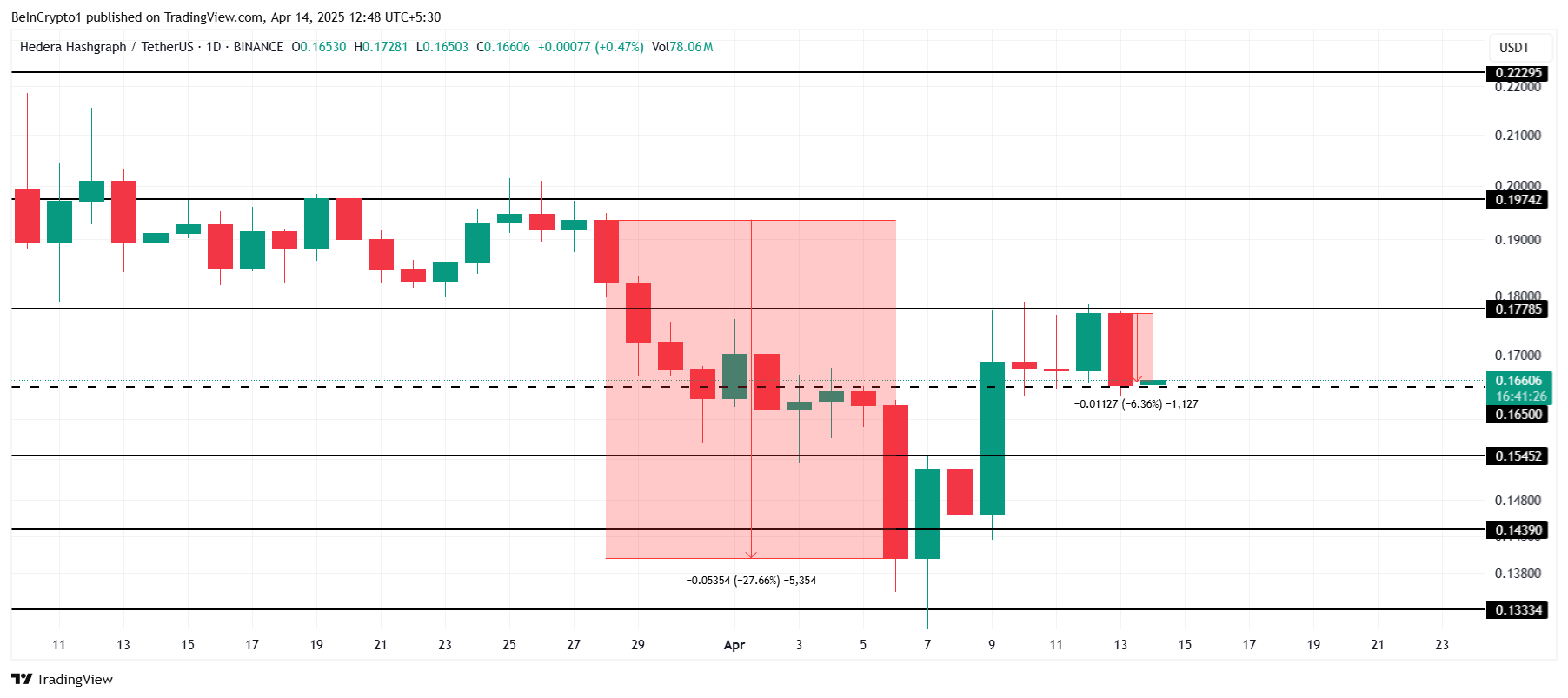 Hedera (HBAR) зазнала труднощів з відновленням імпульсу після корекції на 27 %, що відбулася наприкінці березня.