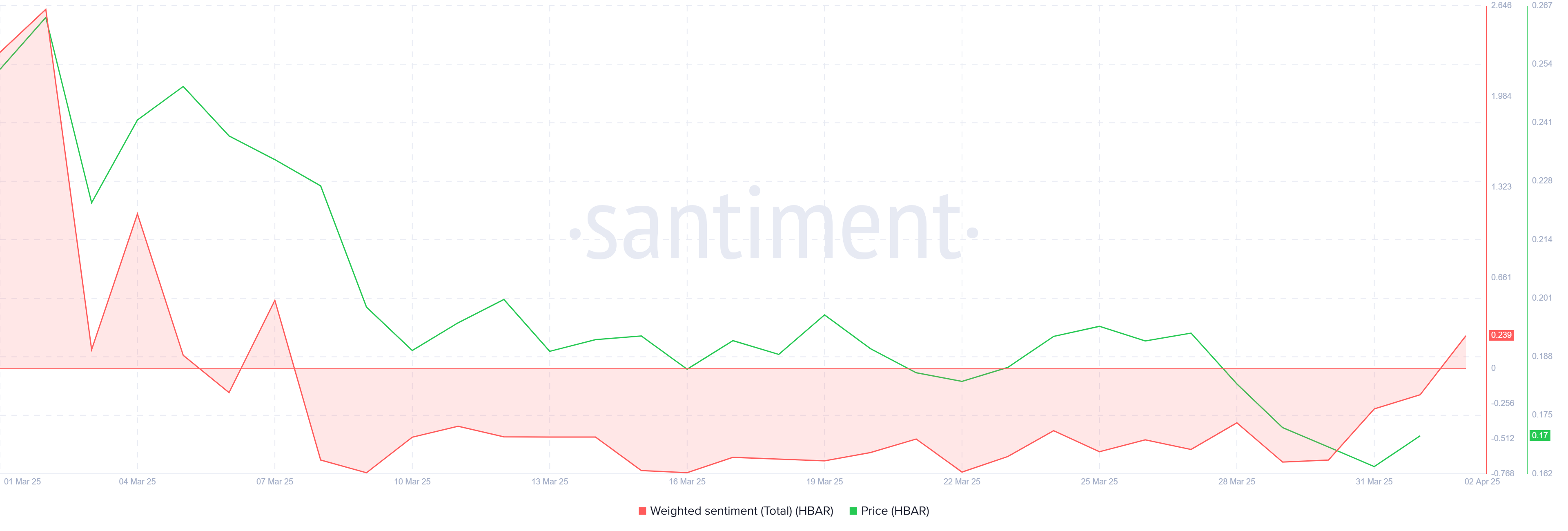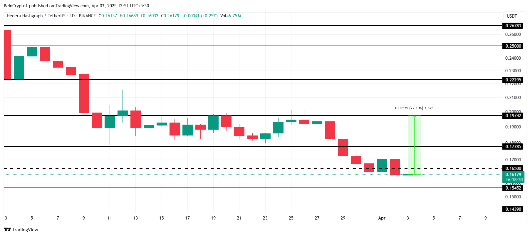 Нині HBAR оцінюється у 0,161 долара, трохи нижче ключового рівня опору 0,165 долара. Наступний значний опір знаходиться на рівні 0,197 долара, який виступав бар’єром для відновлення ціни HBAR. З 22% розривом між поточною ціною та цим опором, подолання цієї перешкоди може відкрити шлях до руху до 0,200 долара.