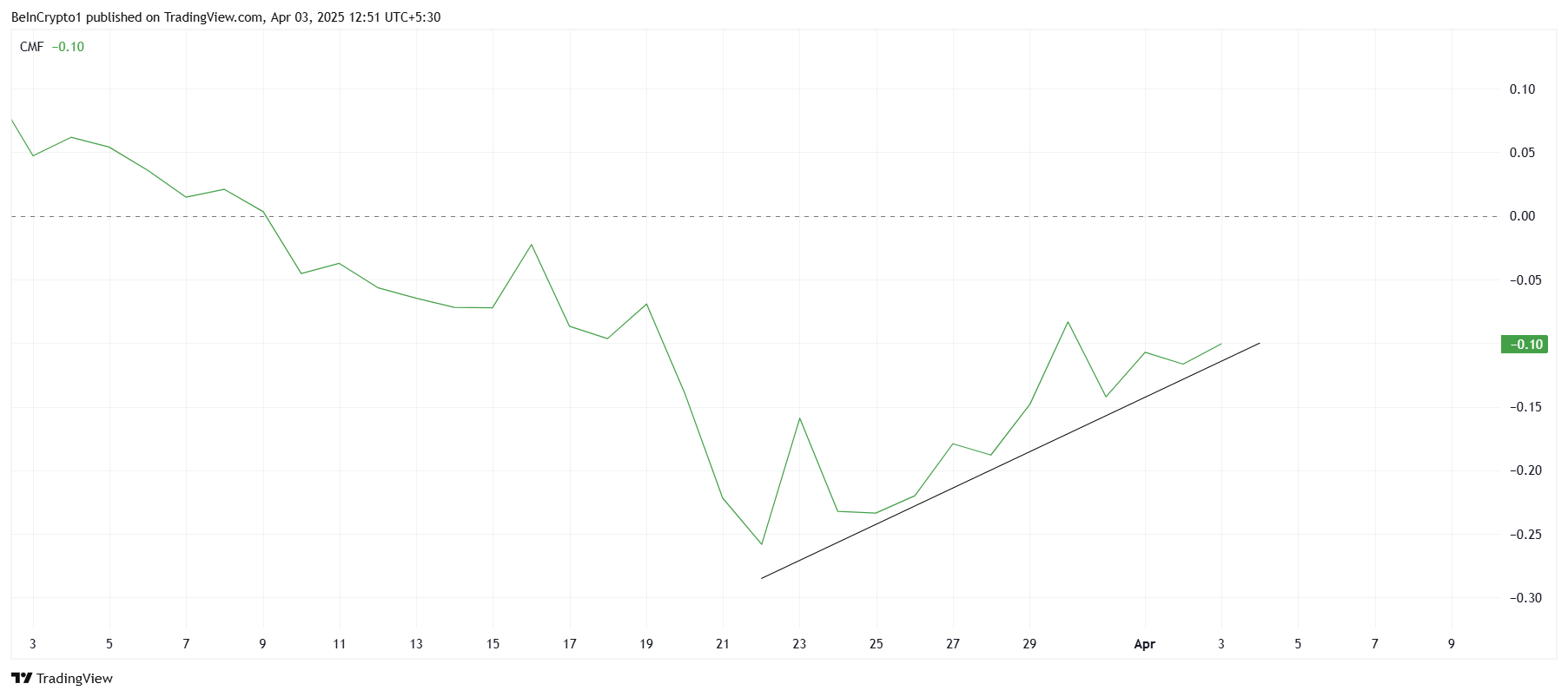 На технічному фронті індикатор Chaikin Money Flow (CMF) показує ознаки відновлення. CMF почав підніматися, сигналізуючи про потенційне збільшення припливів. Хоча він ще не перетнув нульову лінію, зростаючий позитивний імпульс вказує на те, що більше капіталу може надходити на ринок. Продовження припливів може надати необхідний поштовх для прориву HBAR через ключові рівні опору.