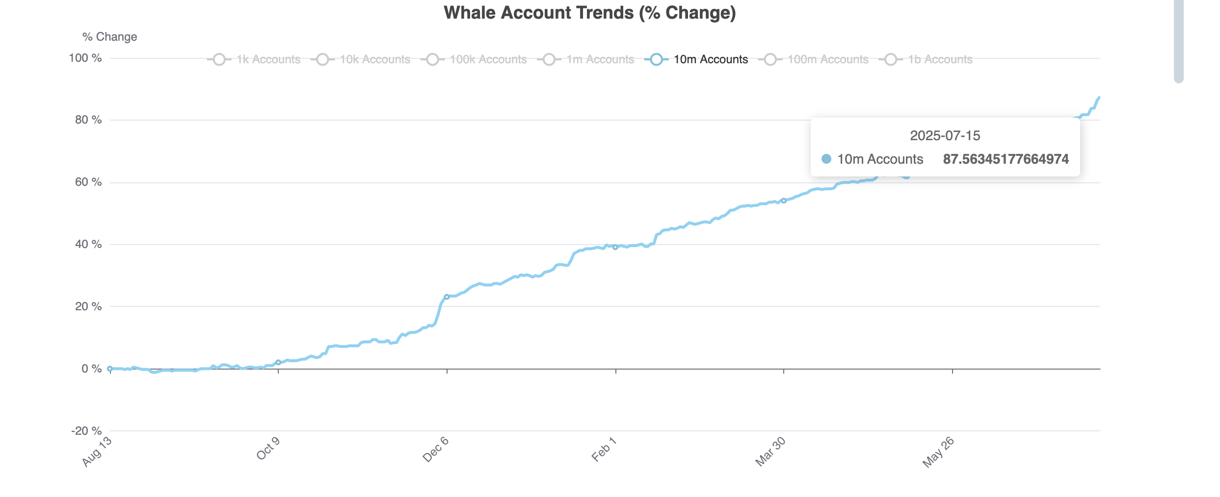 Це різке зростання свідчить про високу впевненість у купівлі великими власниками, що часто є ознакою очікування вищих цін у майбутньому. Коли інвестори з великими капіталами швидко збільшують свої частки, це сигналізує про впевненість або ймовірне знання про майбутнє зростання.