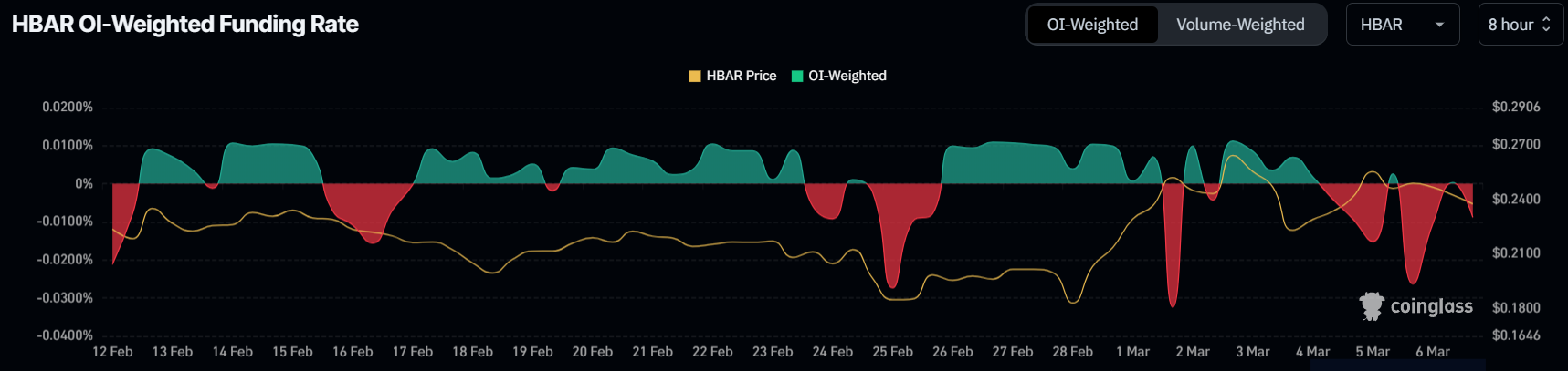Окрім кореляції з біткоїном, макроімпульс HBAR також формується від’ємним рівнем фінансування. Цей показник коливається і залишається у негативній зоні.