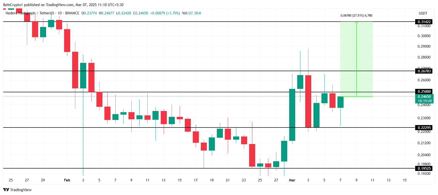 Однак, якщо HBAR зуміє подолати рівень опору у 0,250 доларів і перетворити 0,267 доларів на підтримку, це може сигналізувати про перехід до бичачого тренду. У такому сценарії цей альткоїн може зрости до 0,314 доларів, ефективно спростувавши ведмежу тезу та створивши передумови для більш суттєвого відновлення.