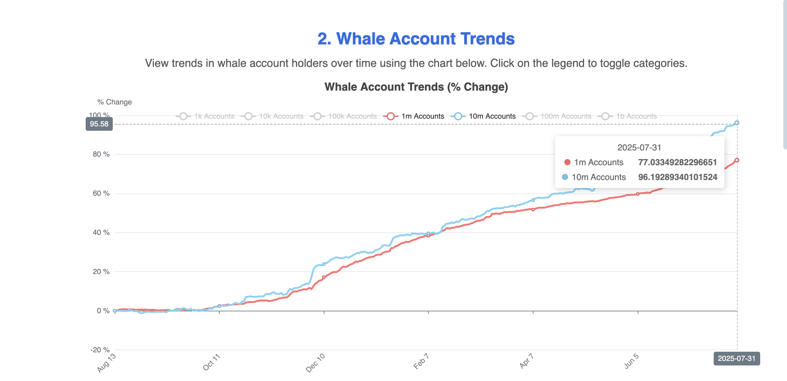 Ончейн-дані показують, що великі власники з 1 мільйоном+ токенів HBAR збільшили свою частку з 64 % до 77 % у липні, тоді як кити з 10 мільйонами+ токенів досягли 96 % від загальної пропозиції.