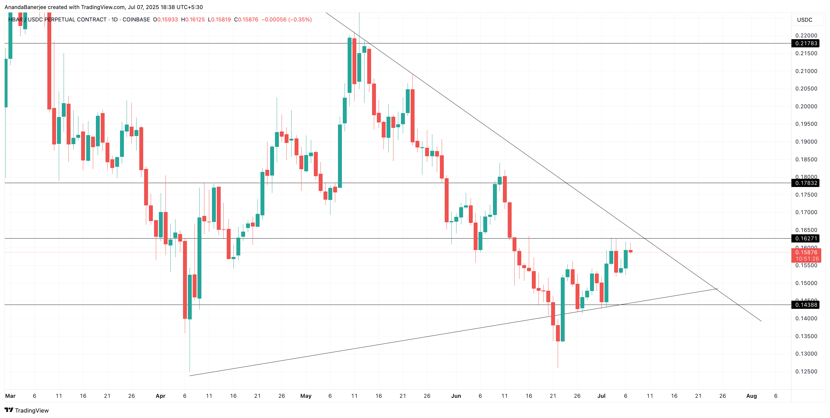 HBAR торгується трохи нижче низхідної лінії тренду, що простягається від березневого максимуму до сьогоднішньої структури. Токен зараз знаходиться трохи нижче опору в $0,162, рівня, який був протестований тричі за останній тиждень, але ще не був пробитий.