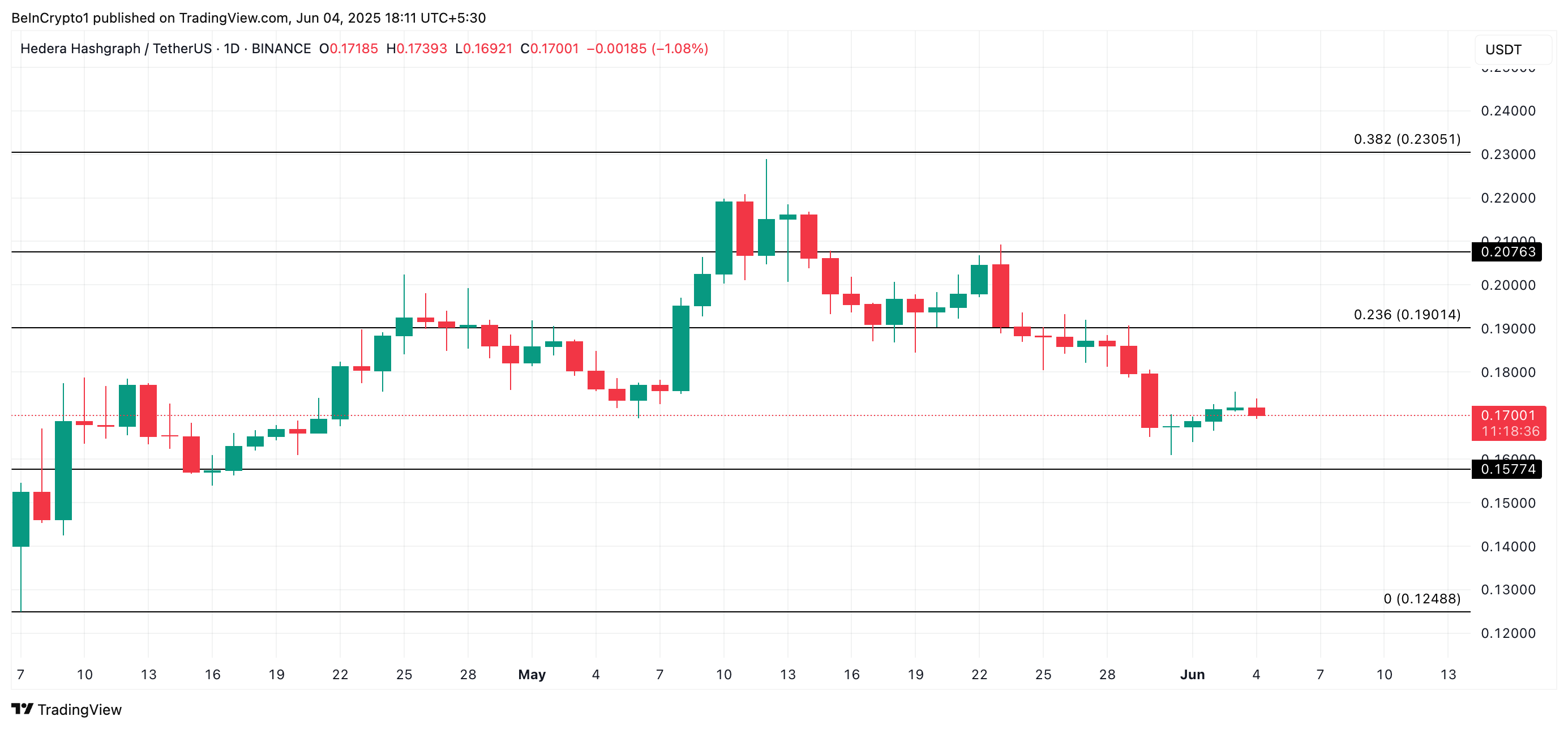 Нативний токен Hedera, HBAR, протистоїть загальним ринковим тенденціям, демонструючи помірне зростання з початку червня. Наразі він торгується за 0,17 доларів, що на 5 % більше за цей період.