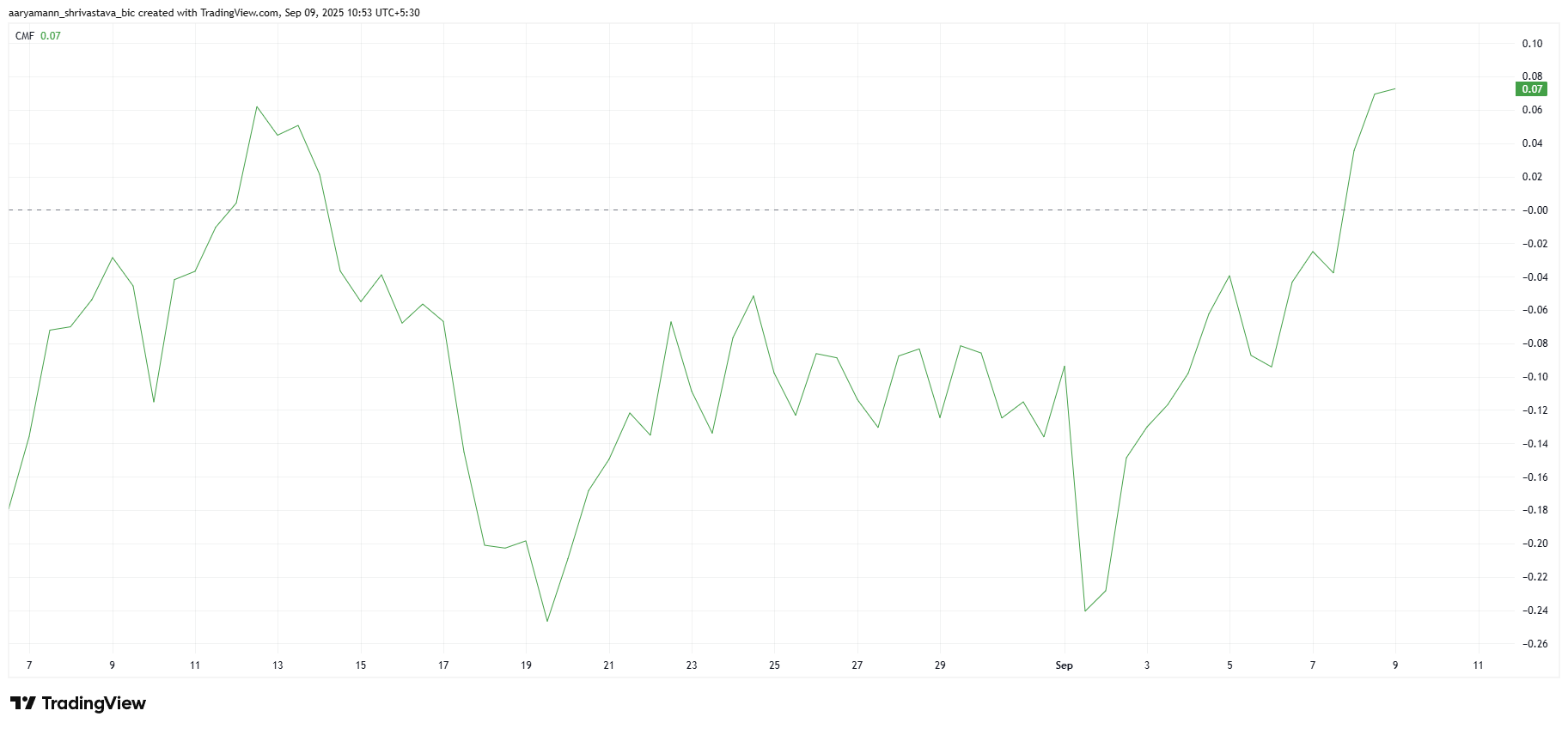 На 12-годинному графіку Chaikin Money Flow (CMF) підкреслює різке зростання, що сигналізує про сильний приплив капіталу в Hedera. Ця тенденція вказує на те, що інвестори залишаються впевненими в потенціалі HBAR, значною мірою ігноруючи регуляторну невизначеність, пов’язану із затримкою схвалення ETF.