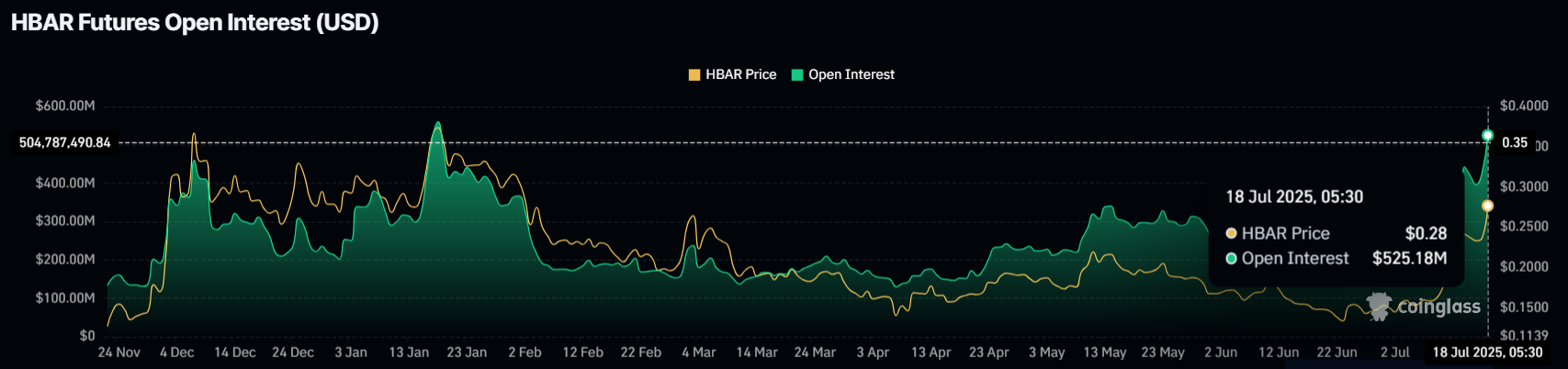 За останній тиждень відкрита зацікавленість (OI) HBAR зросла на 77 %, піднявшись з 296 млн доларів до 526 млн доларів. Цей стрибок на 230 млн доларів підкреслює зростаючий інтерес трейдерів, які прагнуть скористатися недавньою продуктивністю HBAR. Позитивна ставка фінансування ще більше підкріплює цю тенденцію, оскільки довгі контракти переважають короткі.