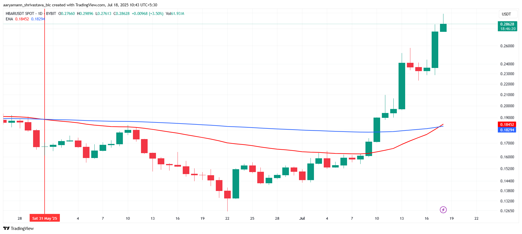 Ціна HBAR наразі становить 0,284 доларів, що відображає зростання на 20 % за останні 24 години. Альткоїн зміг закріпити сильний рівень підтримки на 0,267 доларів, що є важливим для збереження його недавніх здобутків. Тестування цієї ціни як підлоги підтримки допоможе стабілізувати ринок і забезпечити основу для подальшого зростання.
