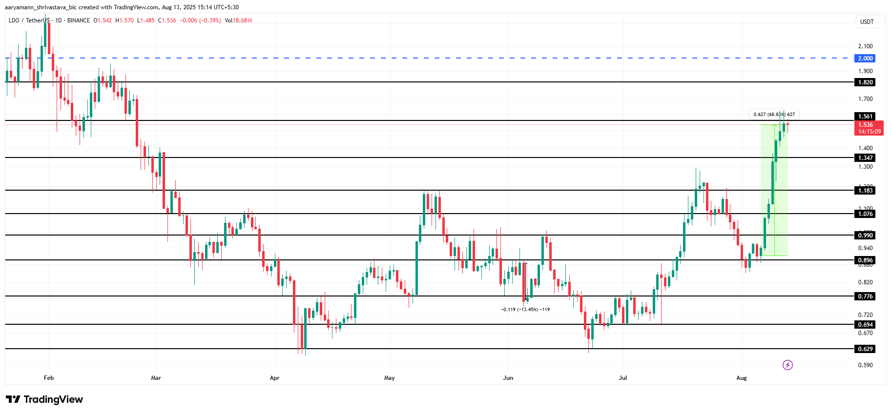 Зі зростанням нових адрес та зростаючим ажіотажем навколо Оновлення для власників токенів, LDO має потенціал перевищити 1,56 доларів. Якщо імпульс продовжиться, LDO може досягти 2,00 доларів, що стане значним етапом для альткоїна.