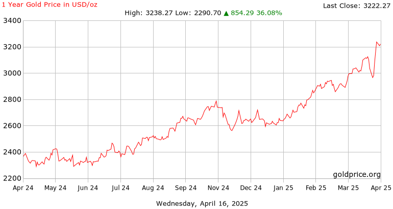 На момент написання, золото перевищило 3 000 доларів, досягнувши піку в 3 317 доларів. Це означає зростання на 25 % з початку року.
