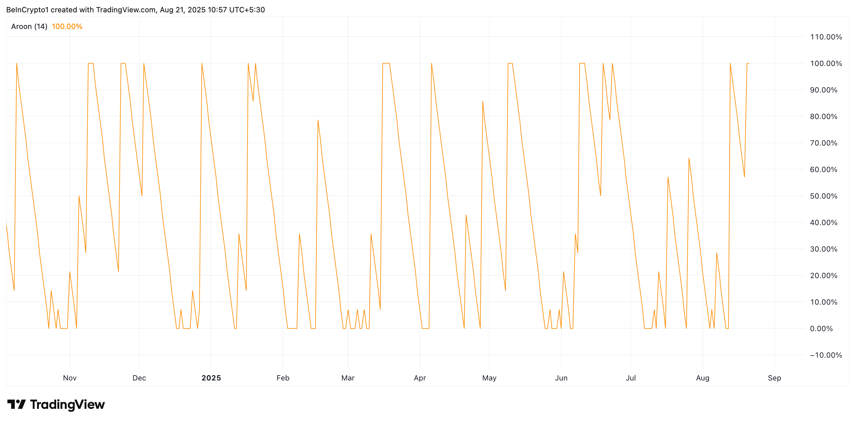 Індикатор Aroon активу вимірює силу та напрямок тренду, відстежуючи час з моменту найвищих та найнижчих цін за певний період. Він складається з двох ліній: Aroon Up, яка вимірює бичачу активність, та Aroon Down, яка відстежує ведмежий тиск.