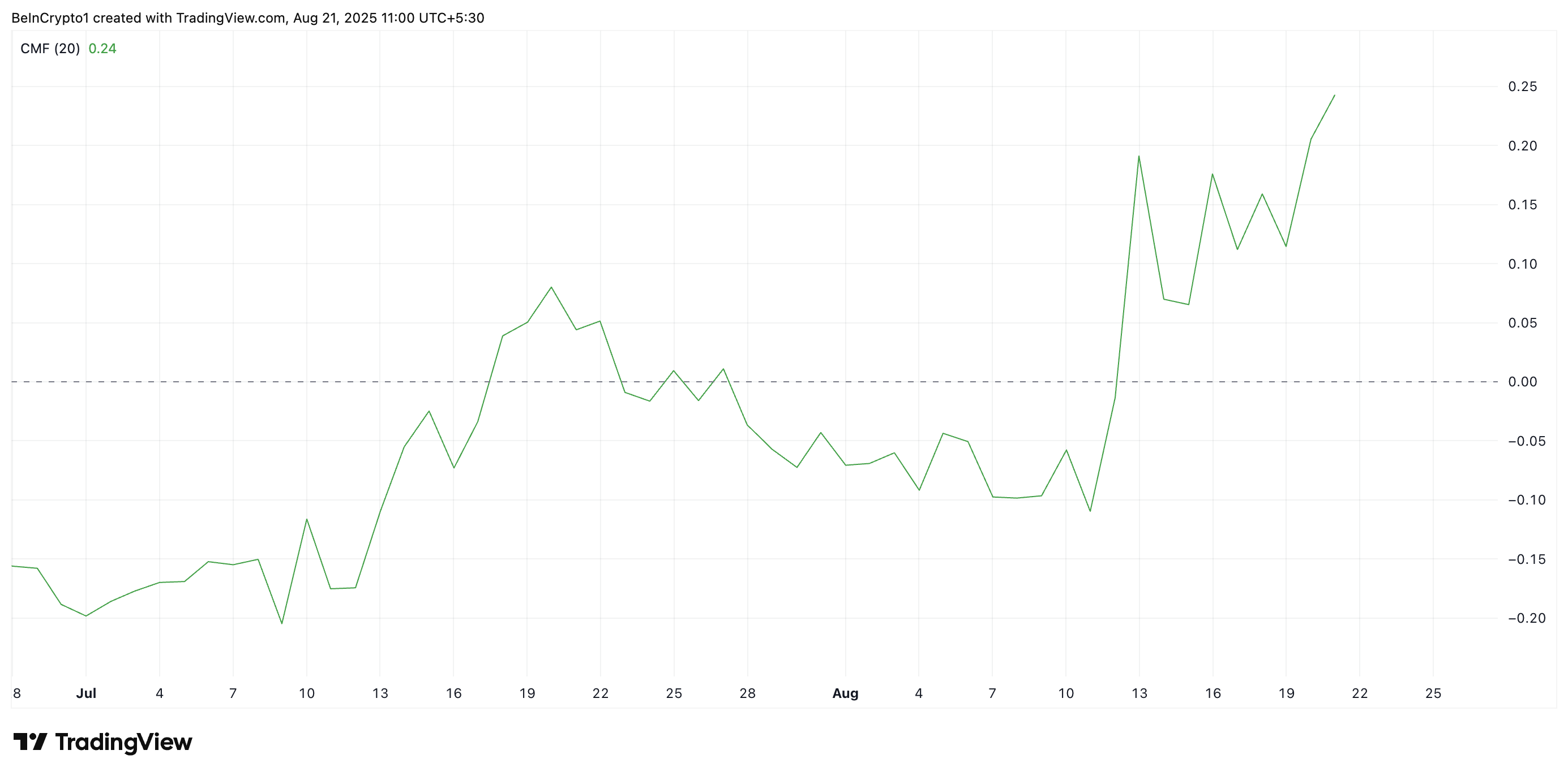 SponsoredКрім того, Chaikin Money Flow (CMF) OKB знаходиться вище нульової лінії і на момент публікації має висхідний тренд, підтверджуючи приплив ліквідності. Ключовий індикатор імпульсу, який вимірює, як гроші надходять на ринок і виходять з нього, наразі знаходиться на тримісячному максимумі 0,24.