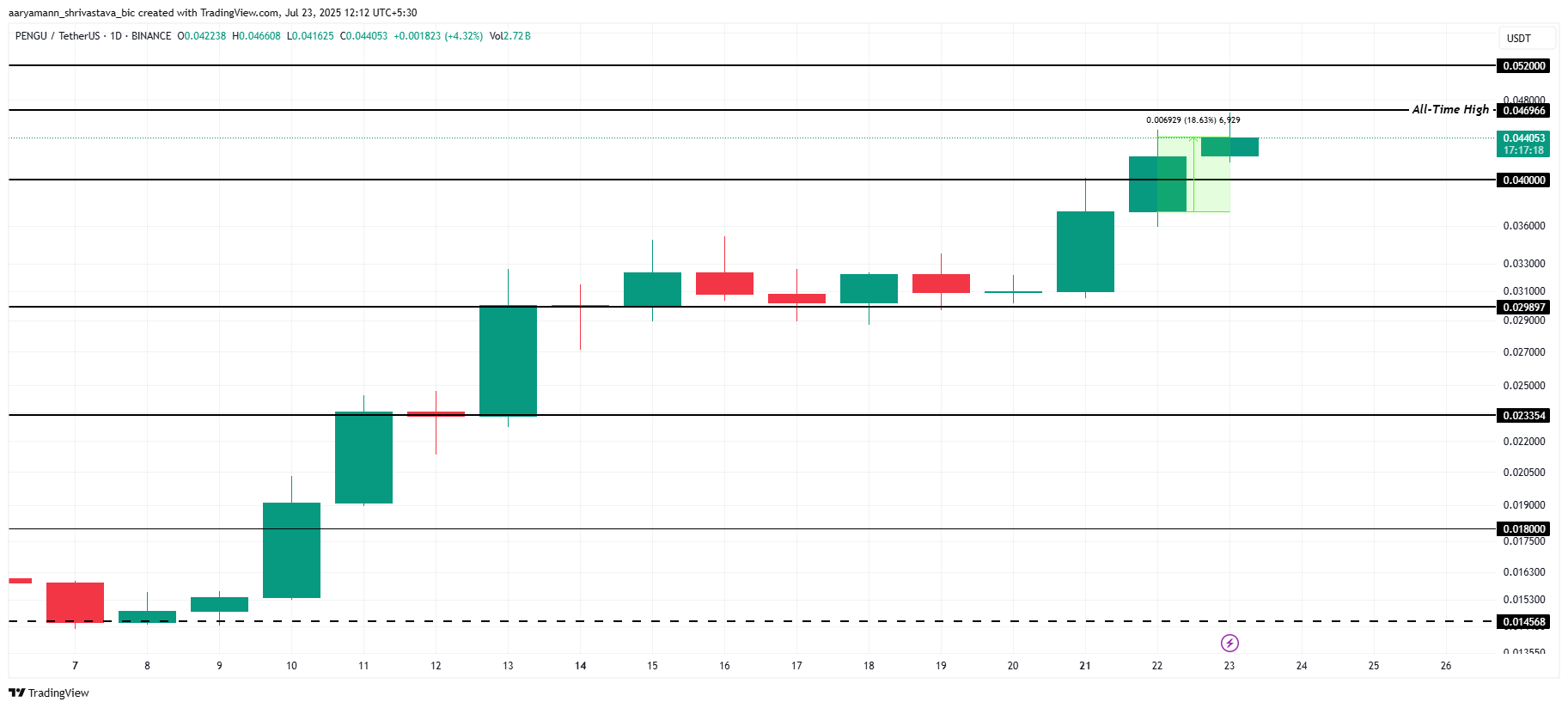 Pudgy Penguins (PENGU) нещодавно досягли нового історичного максимуму (ATH) у розмірі 0,046 доларів, що стало шестимісячним досягненням для цього мемкоїна.