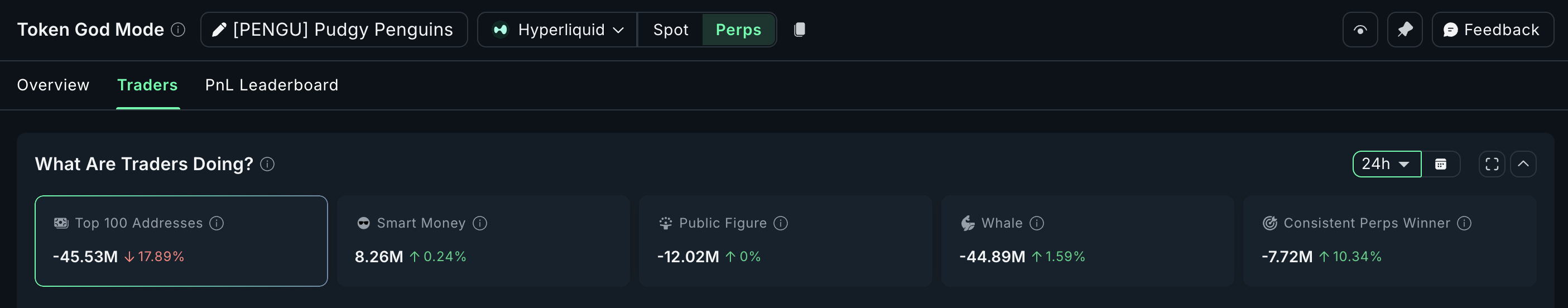 Великі власники на спотовому ринку скоротили свої активи на 3,62% і тепер утримують близько 1,19 млрд PENGU. Це скорочення еквівалентне приблизно 43 млн PENGU, що свідчить про використання великими гравцями відскоку для зменшення позицій, імовірно, шляхом фіксації прибутку. Така динаміка вказує на ослаблення впевненості у подальшому зростанні.