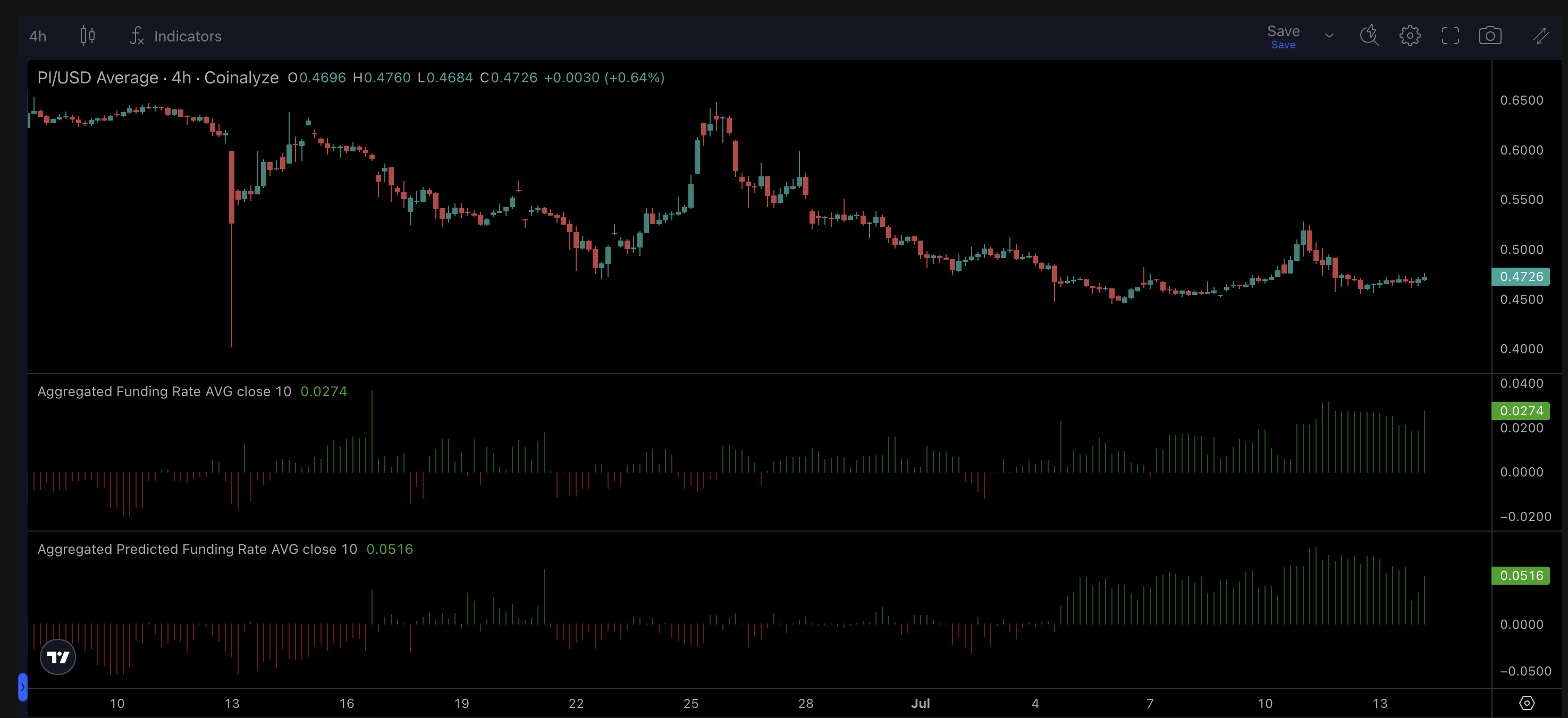 Pi Coin (PI) наразі торгується за 0,4725 доларів, перебуваючи трохи вище ключового рівня підтримки на 0,4452 доларів. Цей рівень був визначений за допомогою інструменту корекції Фібоначчі, накресленого від максимуму кінця червня до мінімуму 6 липня.