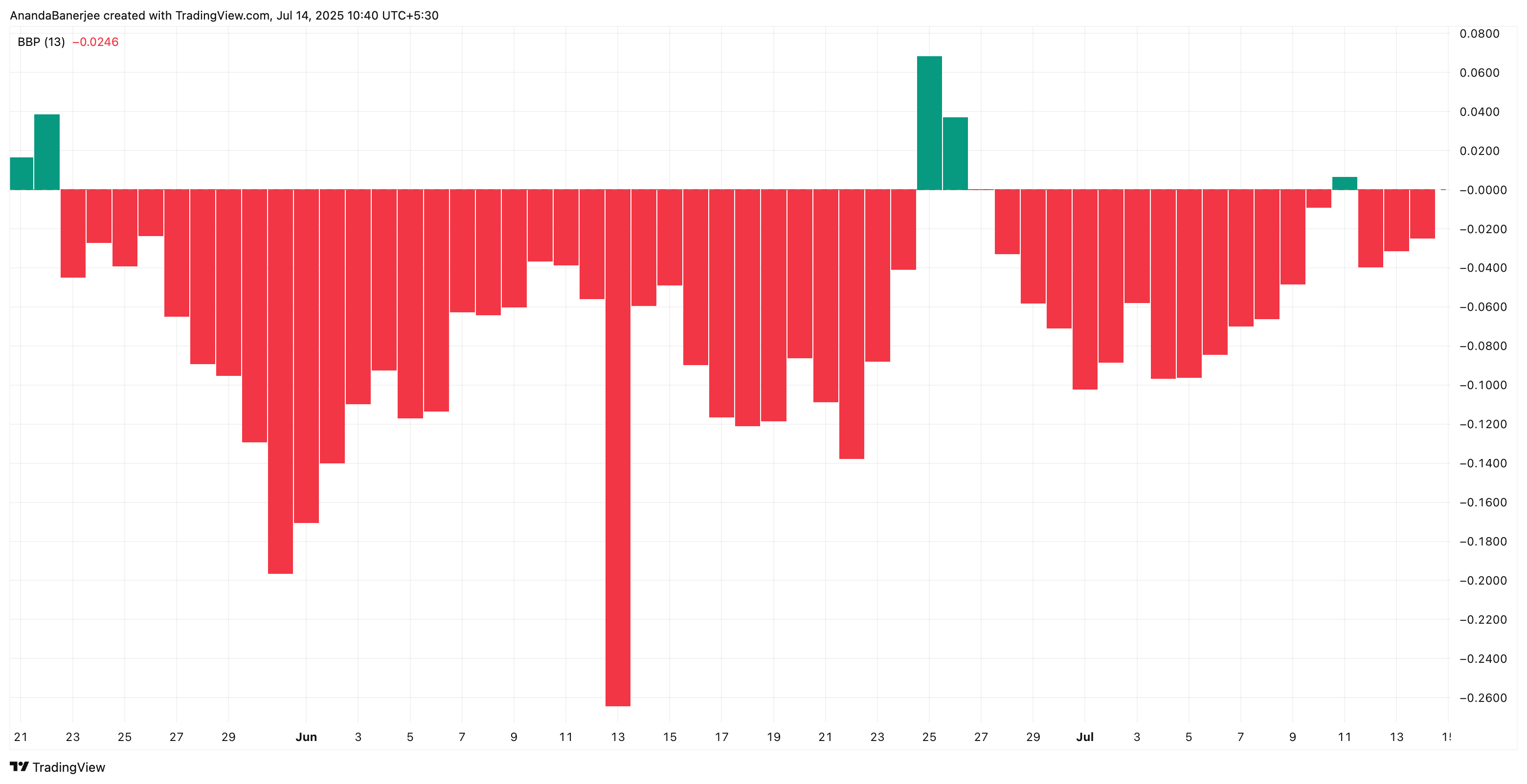 На момент написання, Bear Power продовжує слабшати, сигналізуючи про те, що ведмежий імпульс зникає.