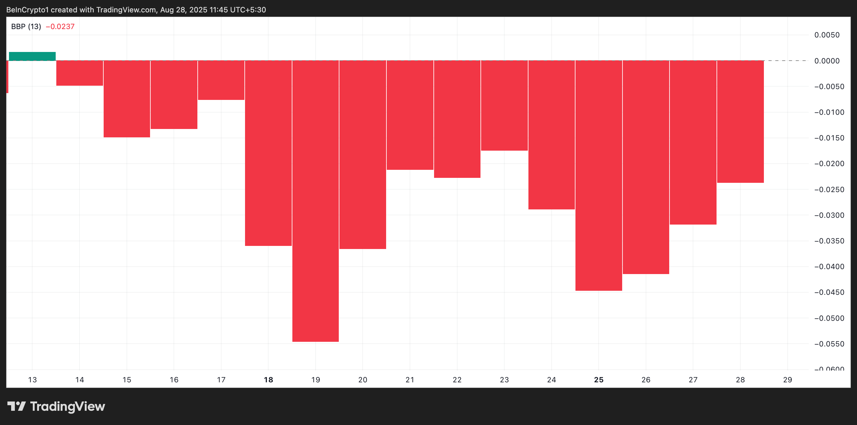 Індекс Elder-Ray вимірює силу покупців (бичача сила) та продавців (ведмежа сила) на ринку. Негативне значення вказує на домінування ведмедів, що свідчить про те, що тиск продажів перевищує інтерес до купівлі.