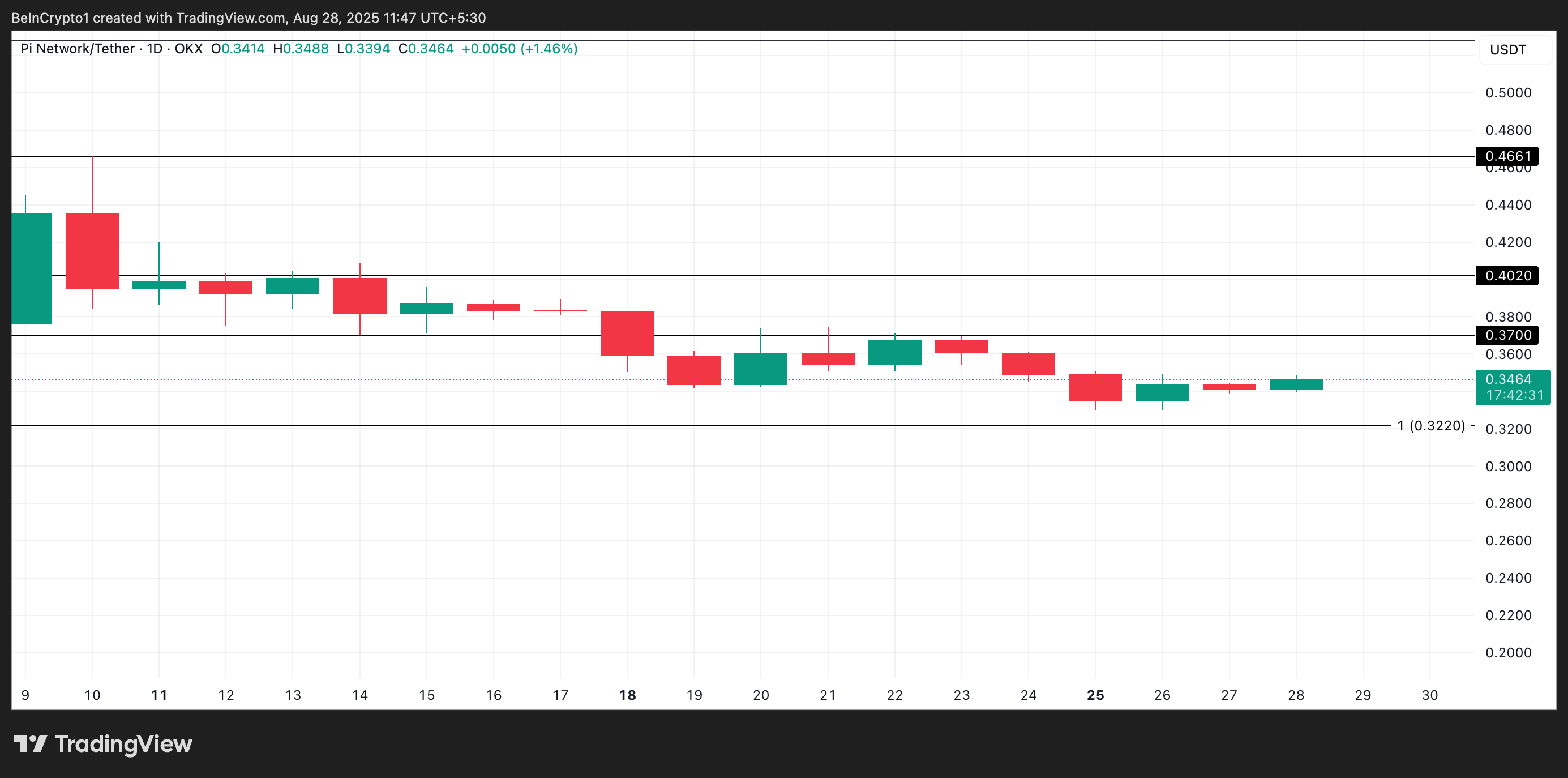 Однак, незважаючи на ці розробки, токен PI не зазнав значних бичачих рухів за останню добу, продовжуючи торгуватися у вузькому боковому діапазоні.