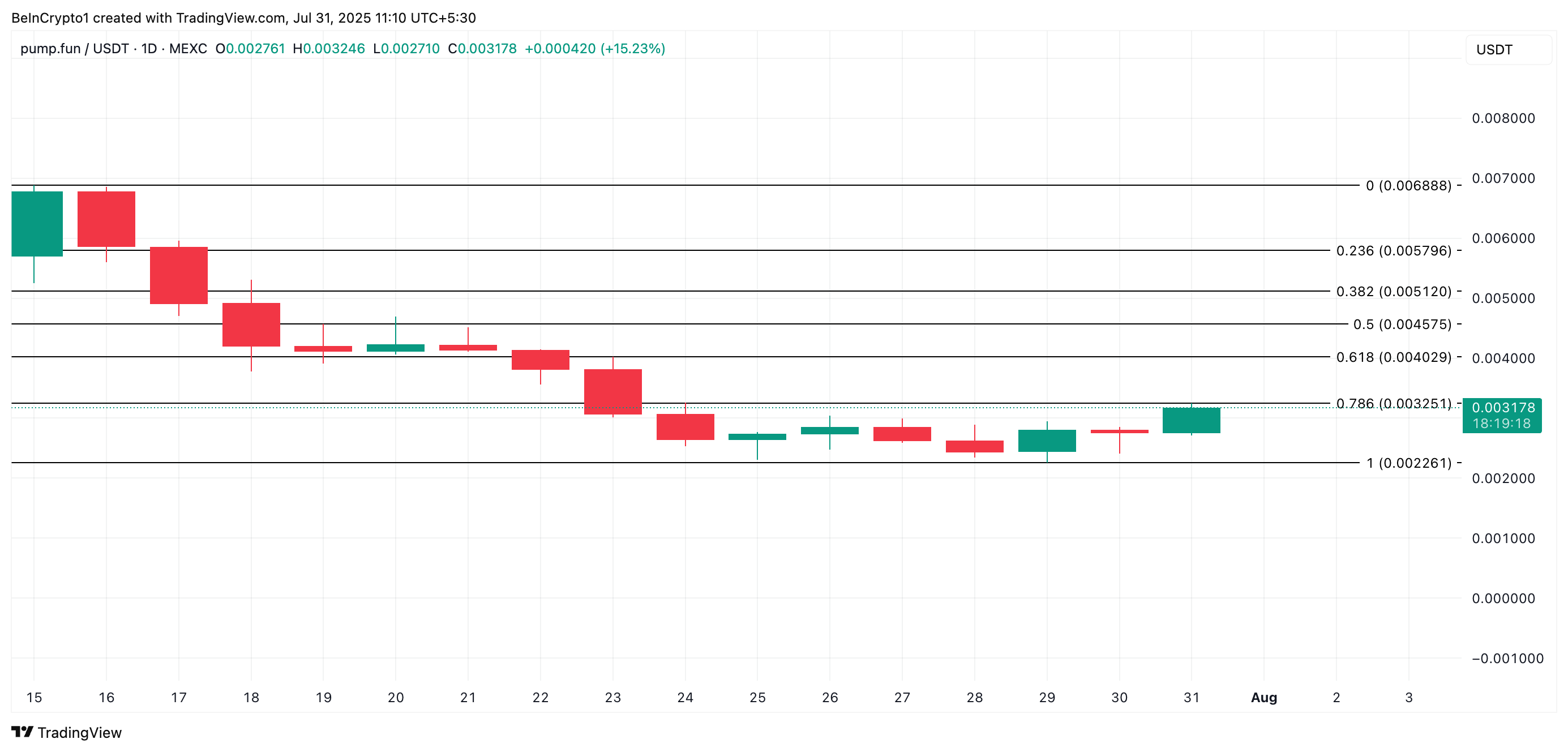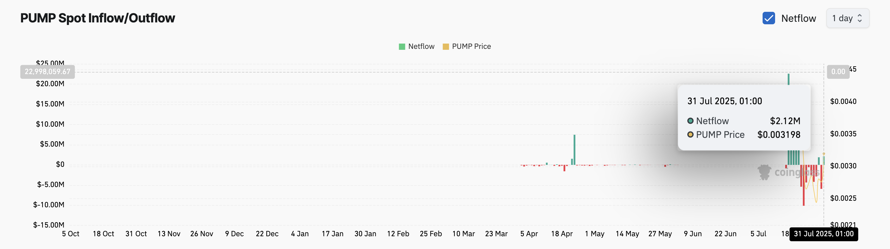 На момент публікації PUMP торгується за 0,0031 долара, трохи нижче ключового опору на рівні 0,0032 долара. Якщо припливи капіталу продовжать зростати, цей рівень може бути подолано, перетворивши його на нову підлогу підтримки.