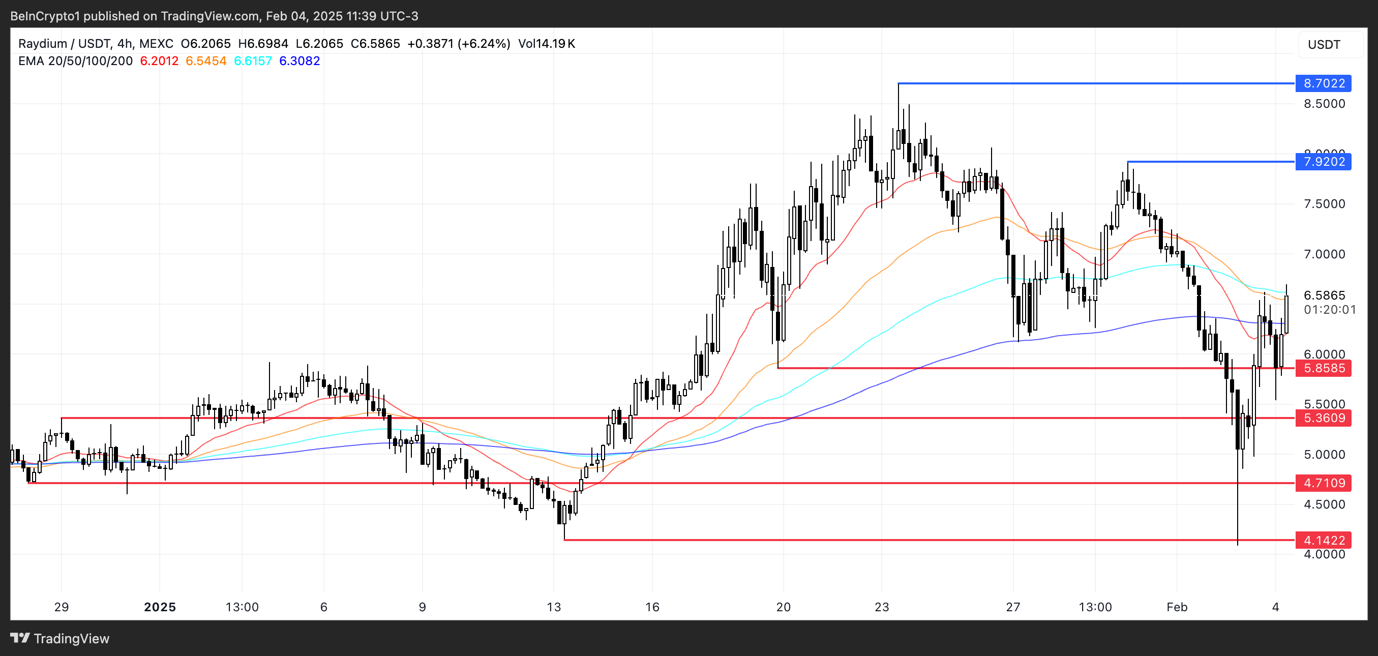 Однак, якщо RAY не зможе зберегти свій моментум, він може протестувати підтримку на рівні 5,85 доларів, з проривом, що веде до 5,36 доларів. Глибший розпродаж може призвести до подальшого падіння до 4,71 доларів або навіть 4,14 доларів, що стане його найнижчим рівнем з 13 січня.