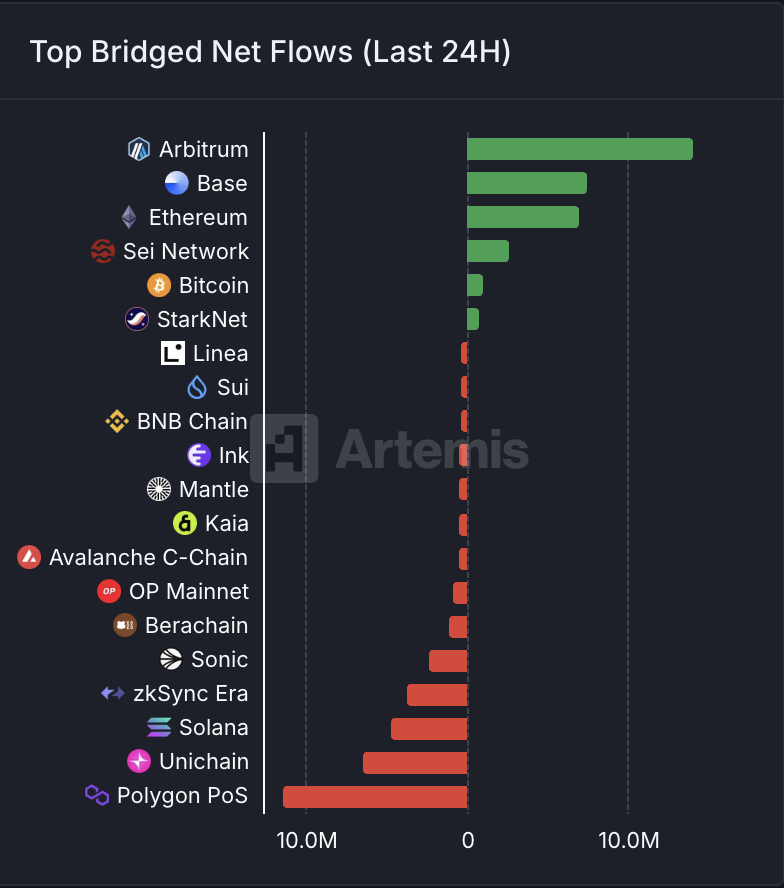 За даними Artemis, мережа Sei за останні 24 години зафіксувала 3 млн доларів у чистих потоках через мости. Для порівняння, провідна мережа Solana за цей час зазнала чистих відтоків на суму 5 млн доларів.