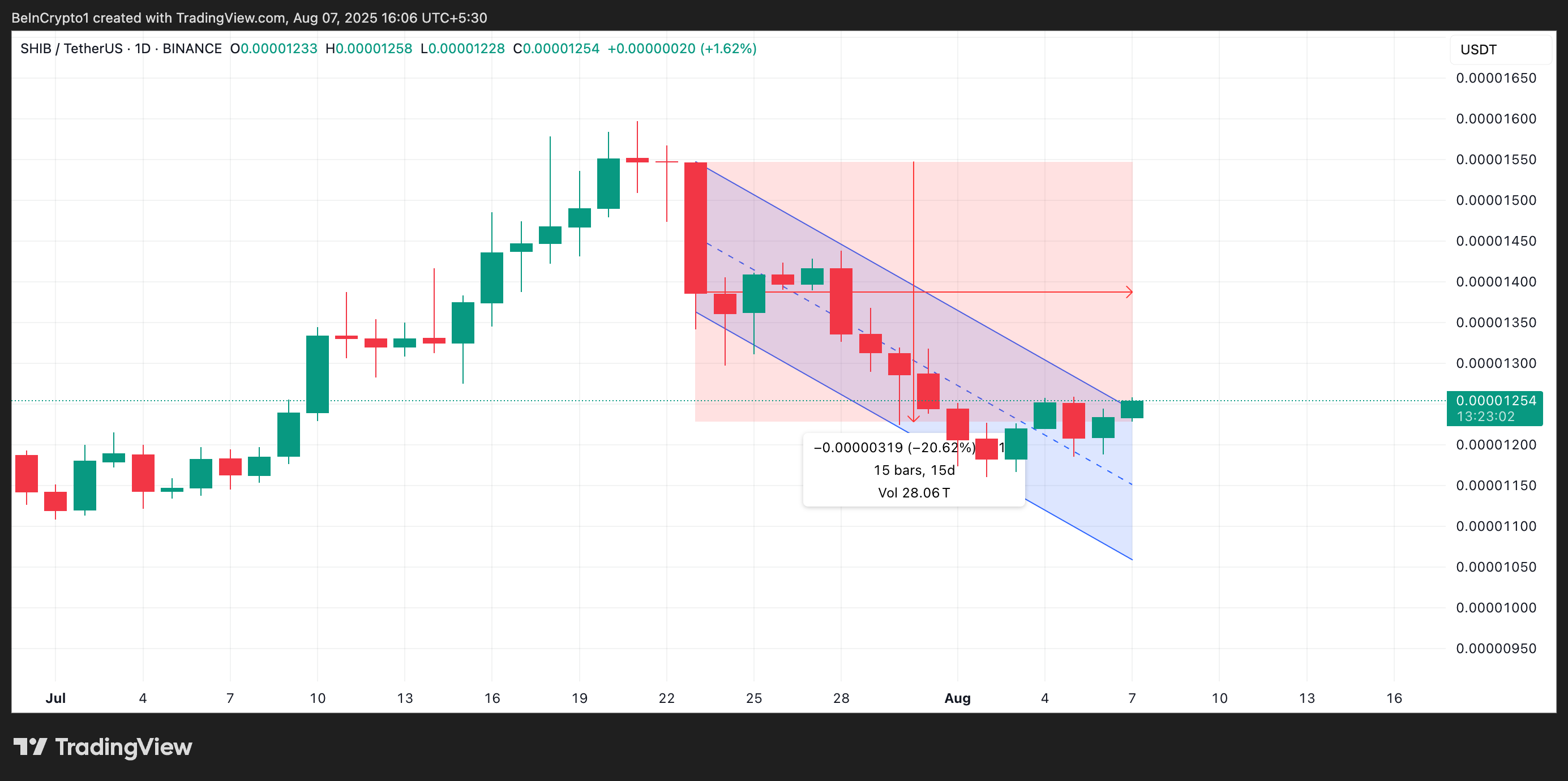 Згідно з даними одноденного графіка SHIB/USD, мемкоїн торгується в межах низхідного паралельного каналу з 23 липня, а його ціна знизилася на двозначні відсотки за цей період.