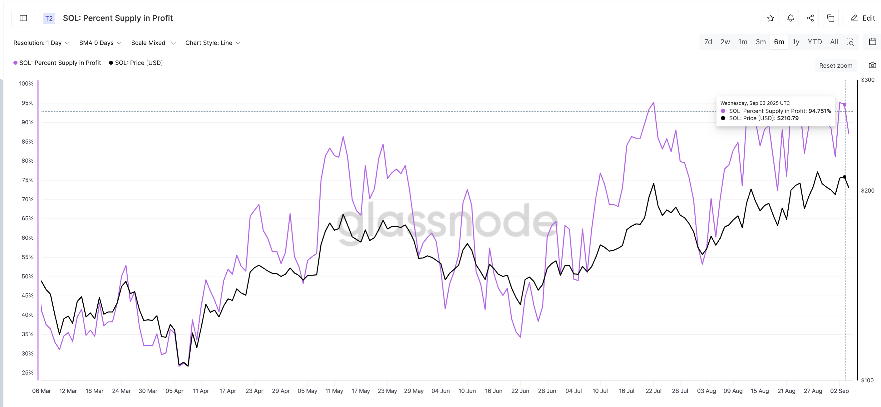 Дані в ланцюжку показують, що відсоток пропозиції в прибутку для Solana все ще дуже високий. Станом на 3 вересня майже 95% власників Solana отримали прибуток, що близько до шестимісячного піку в 96,59% 8 серпня. Навіть на момент друку показник становить близько 87%, що все ще є перегрітим рівнем. Коли такий високий відсоток сидить на прибутку, зростає спокуса продати.