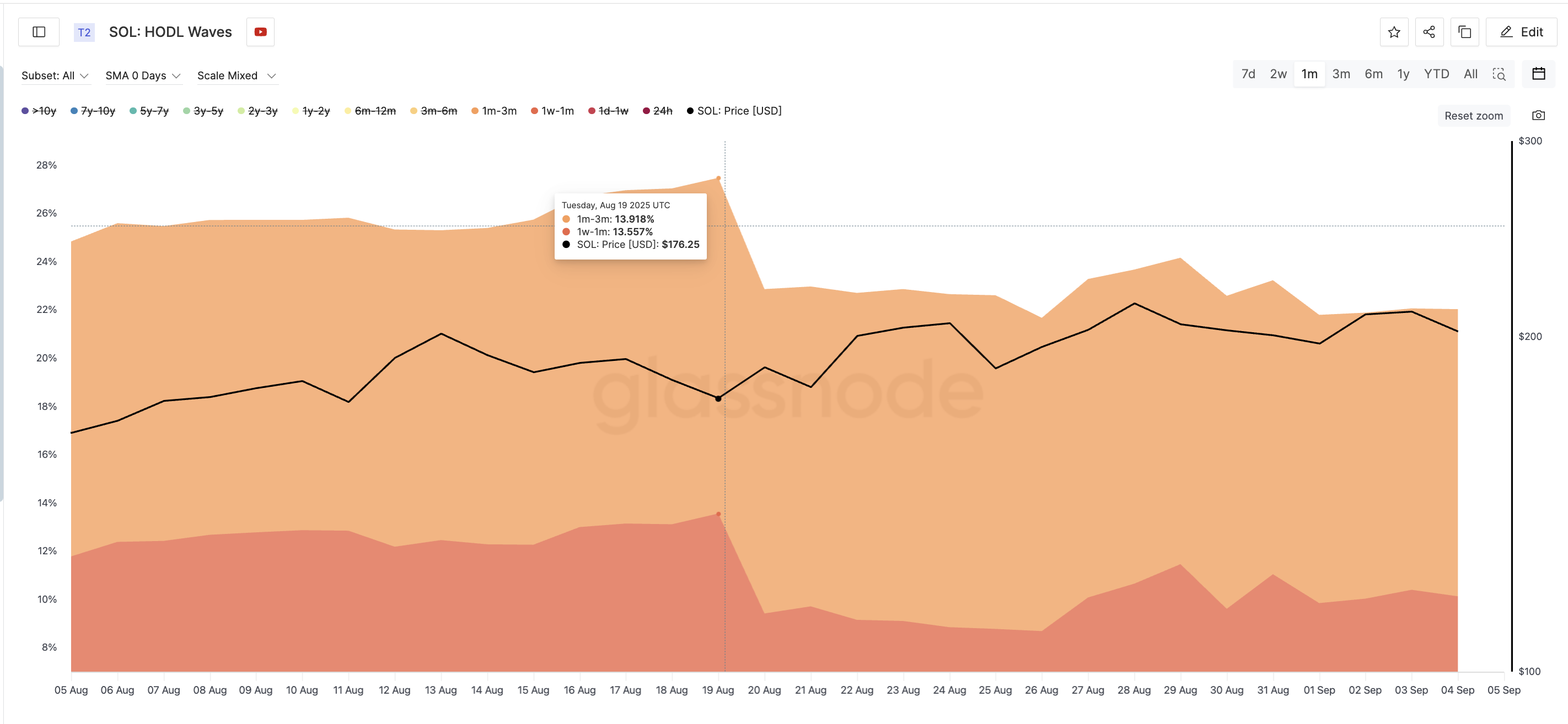 Метрика HODL Waves, яка відстежує, як довго тримають монети перед переміщенням, підтверджує це. Короткострокові власники — ті, хто тримав від 1 тижня до 1 місяця та 1 до 3 місяців — досягли піку 19 серпня, коли ціна Solana торгувалася близько $176.