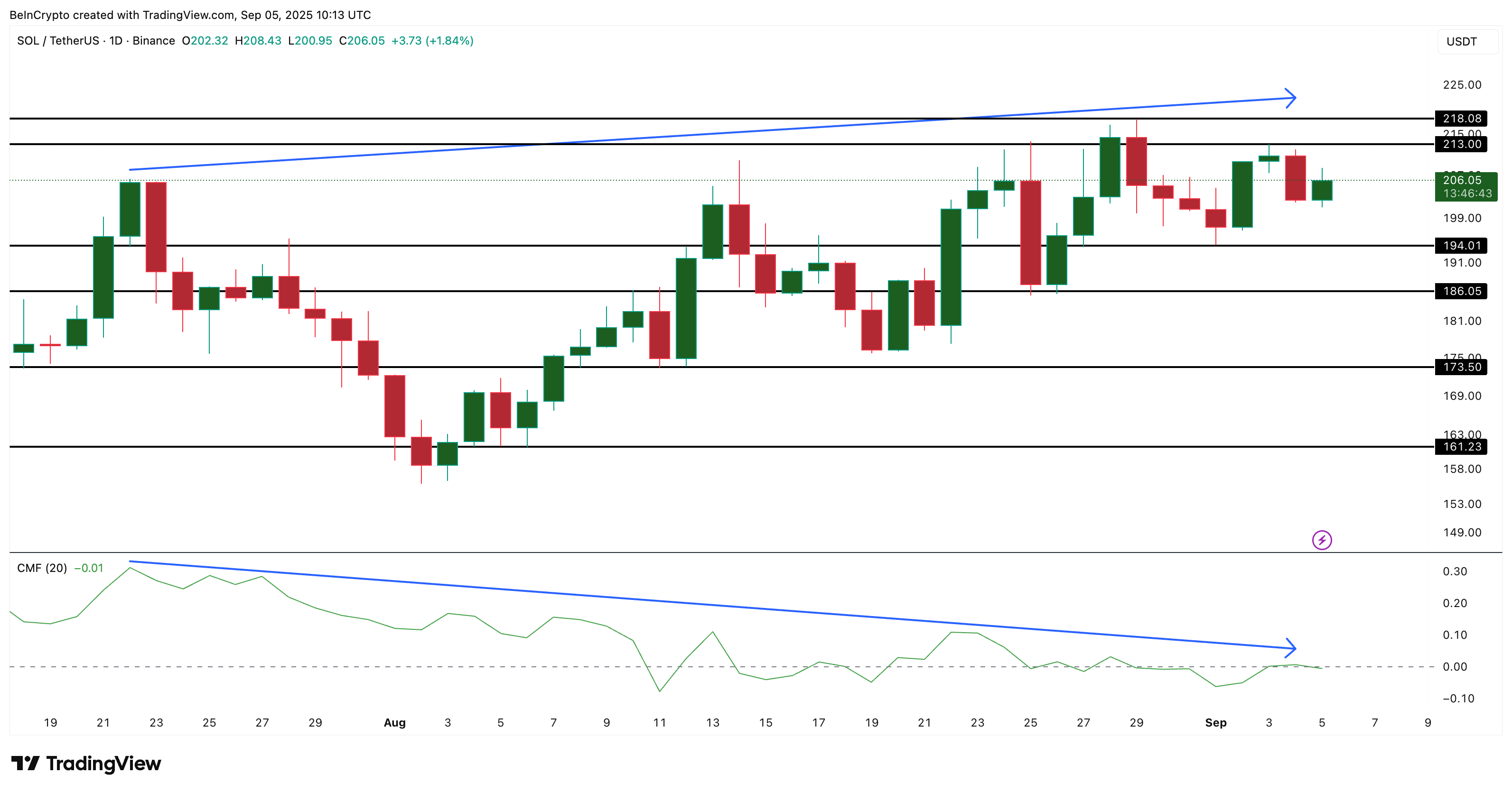 З іншого боку, потужна підтримка знаходиться на рівні $194, а подальші рівні — $186 і $173, якщо продажі поглибляться. В даний час ціна Solana тримається стабільно, але якщо CMF не покращиться, будь-який перепочинок виглядає далеким.