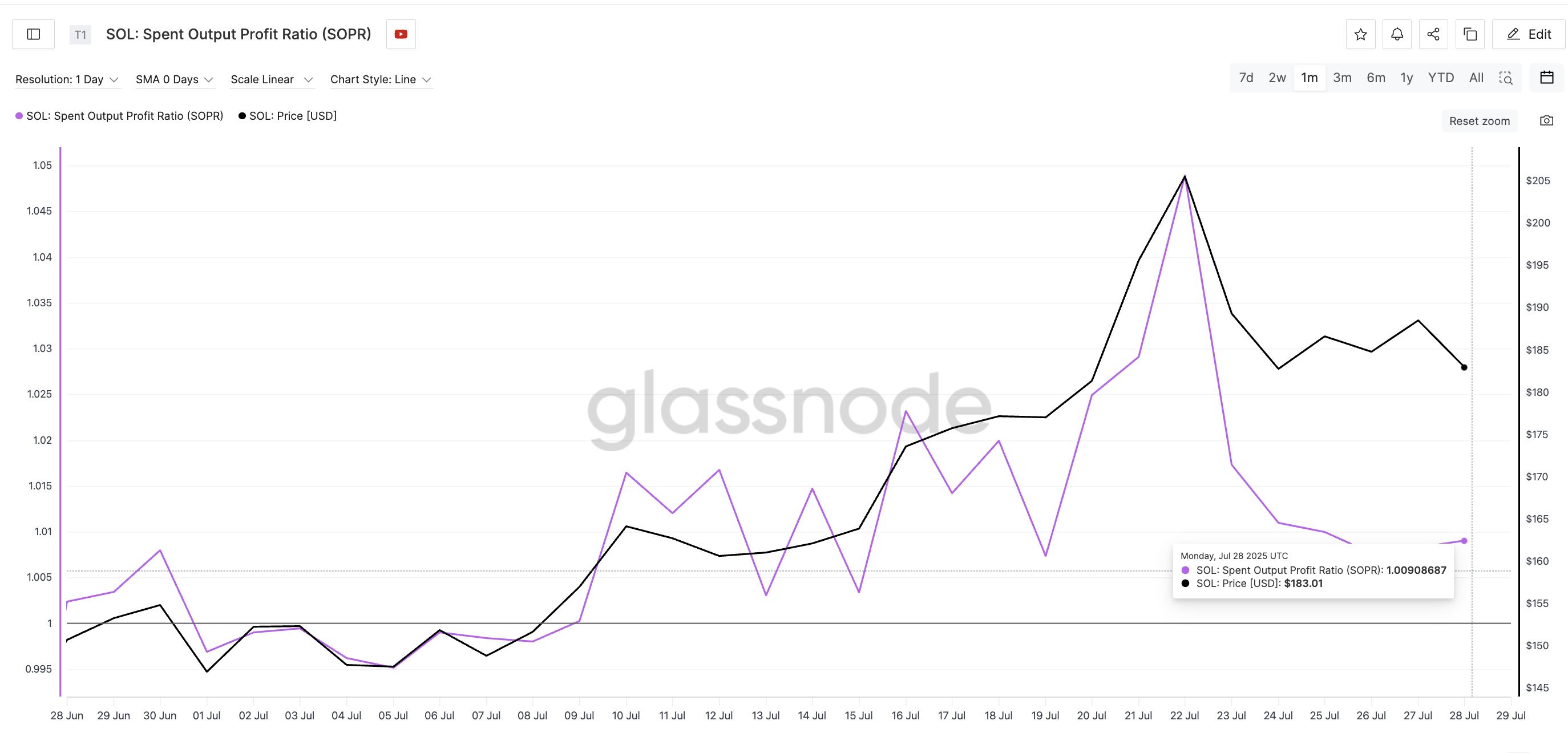 SOPR Solana знизився з 1,04 до майже 1,00 за останній тиждень, що означає, що гаманці, які зараз продають, ледве виходять на беззбитковість.