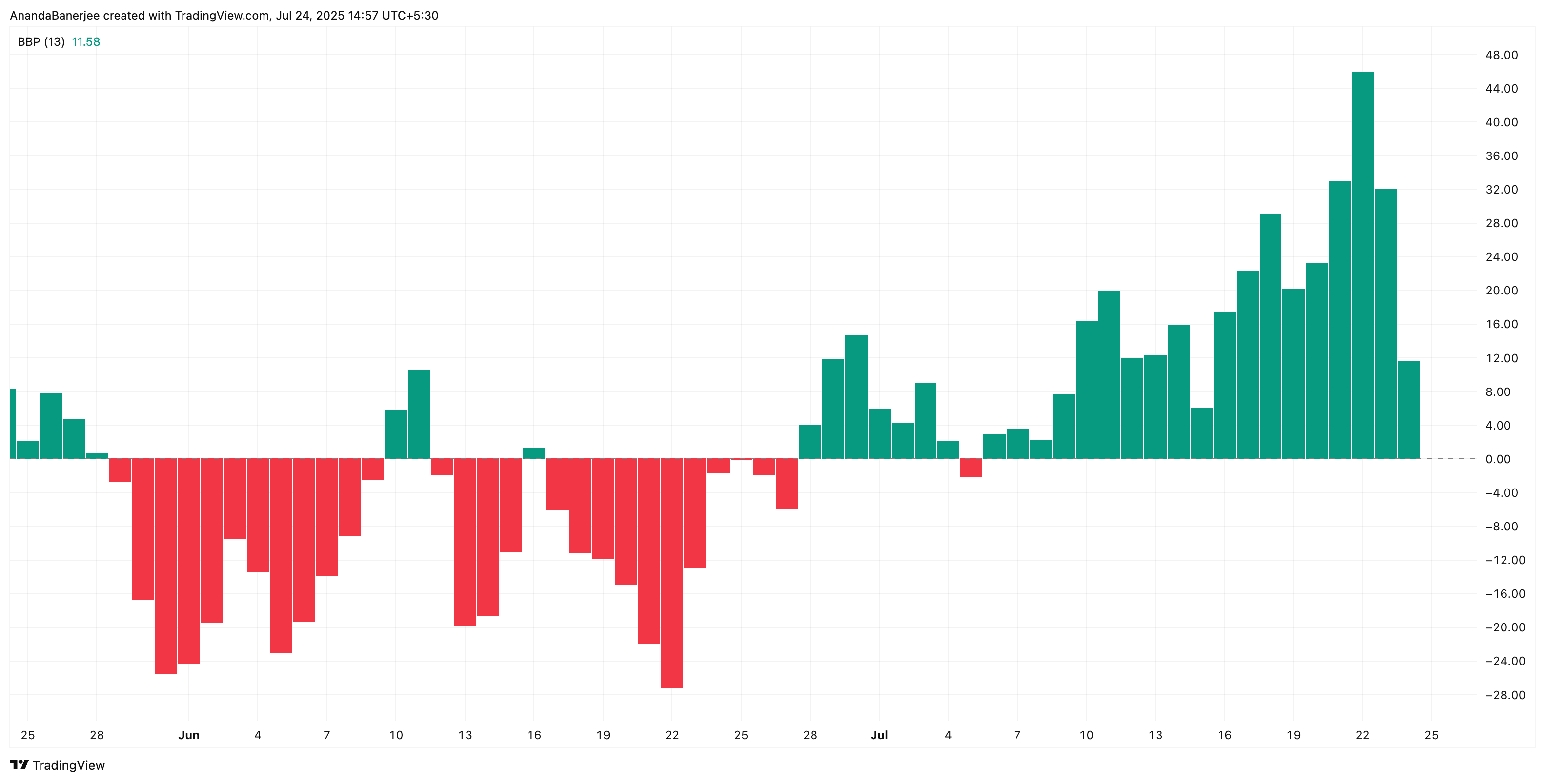 Теплова карта вартості візуалізує, де була придбана більшість токенів. Bull-Bear Power оцінює, хто має більше контролю в поточному тренді: покупці чи продавці. Індекс Bull Bear Power вимірює різницю в силі між покупцями (биками) та продавцями (ведмедями), щоб показати, хто зараз контролює імпульс ціни.