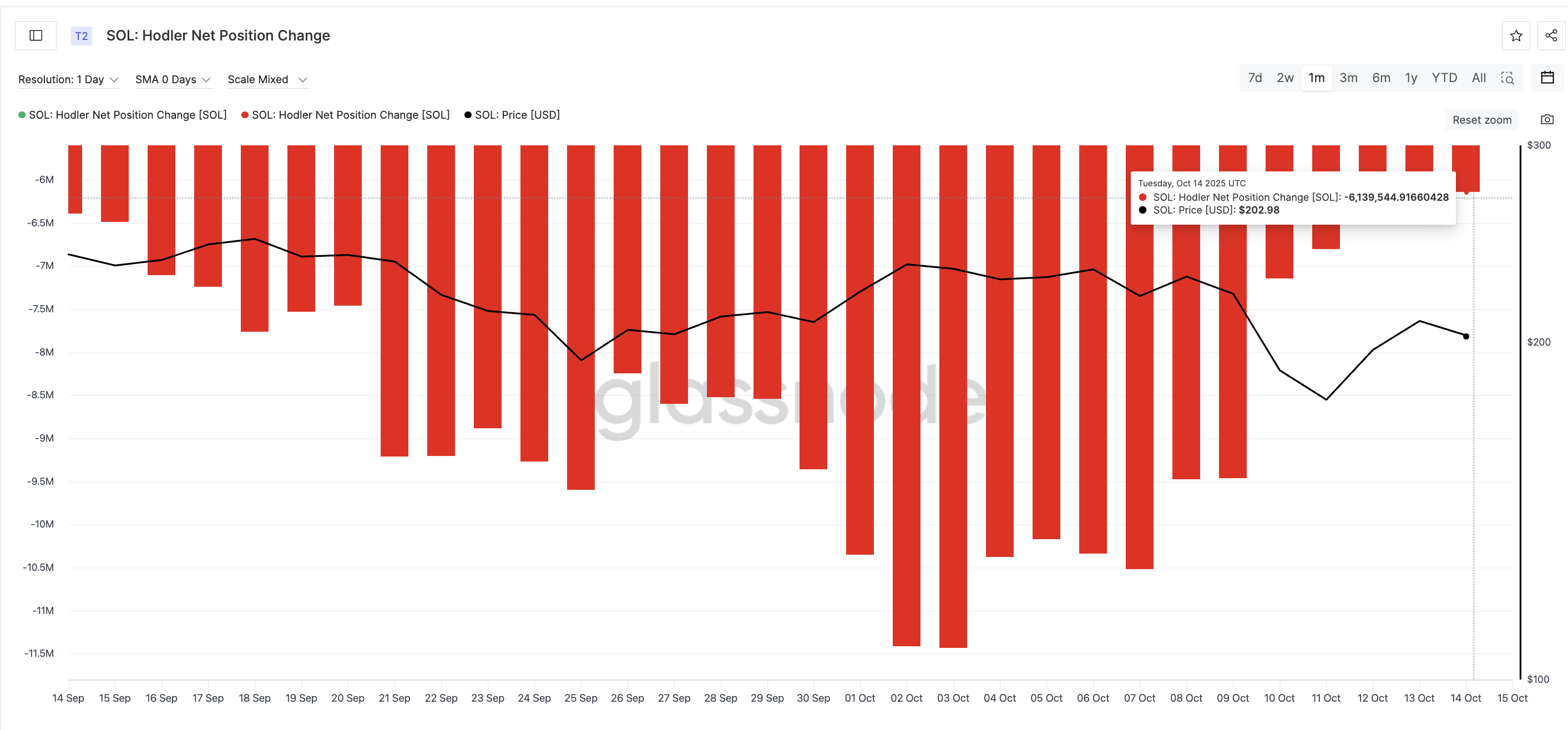 Зміна чистої позиції власників, яка відстежує, скільки довгострокові власники купують або продають, залишається негативною, але швидко покращується. У період з 3 по 14 жовтня довгострокові власники скоротили чисті продажі приблизно з 11,4 млн SOL до 6,1 млн SOL — зниження на 46%.