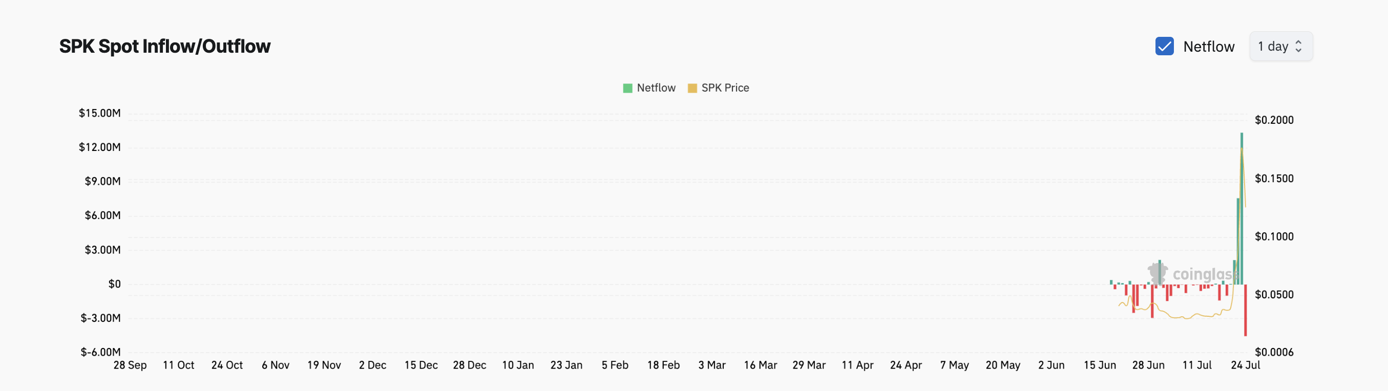 Оцінка спотового нетто-потоку SPK надає уявлення про охолодження ралі. За даними Coinglass, альткоїн зазнав значного зростання нетто-відтоків зі своїх спотових ринків під час сьогоднішньої сесії, що становить 4,53 млн доларів на момент написання.