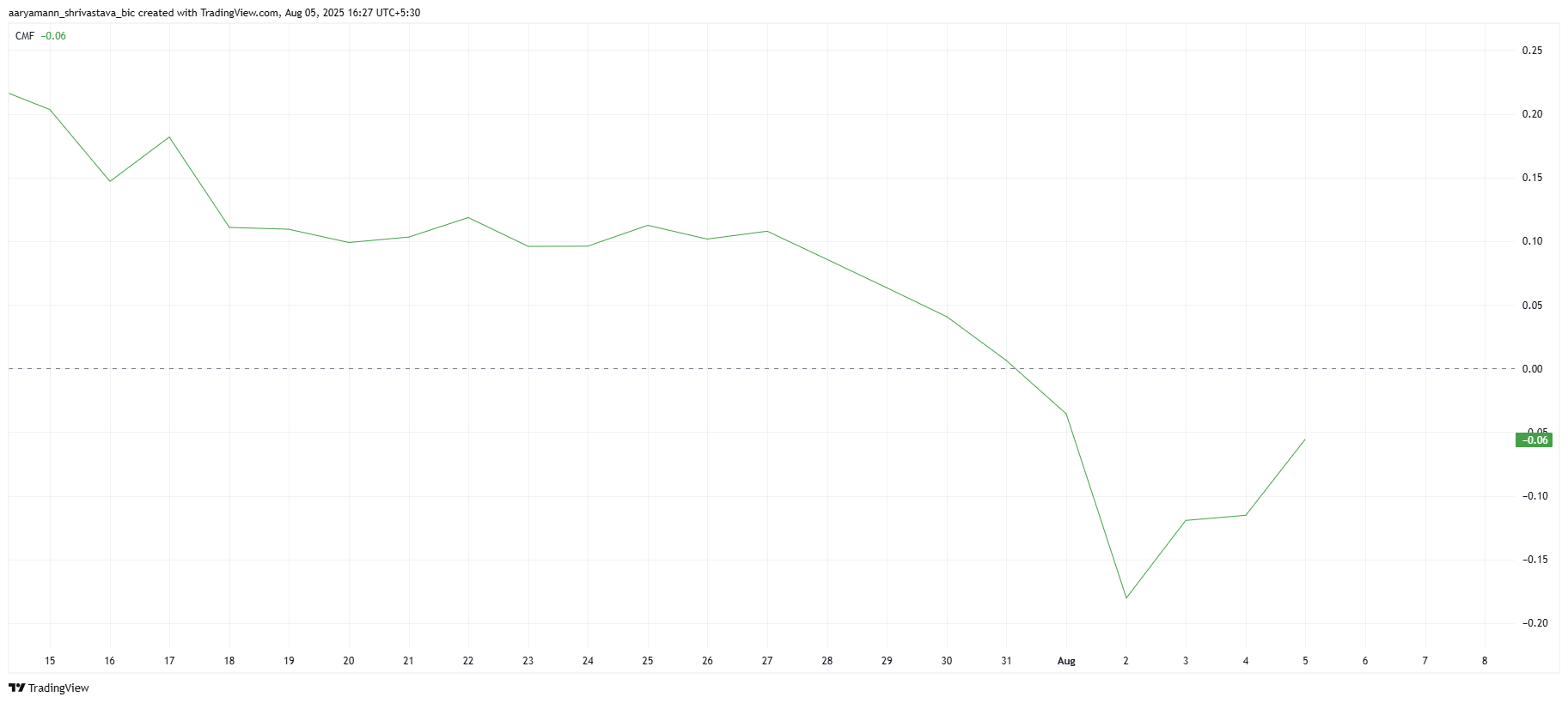 Індикатор Chaikin Money Flow (CMF), який відстежує потік капіталу в актив, показує зростання для Stellar. Це свідчить про те, що XLM спостерігає збільшення притоків, що може бути позитивним сигналом для альткоїна. Однак, хоча CMF зростає, він все ще залишається нижче нульової лінії, що вказує на те, що притоки ще не достатньо сильні, щоб викликати стійкий висхідний тренд.