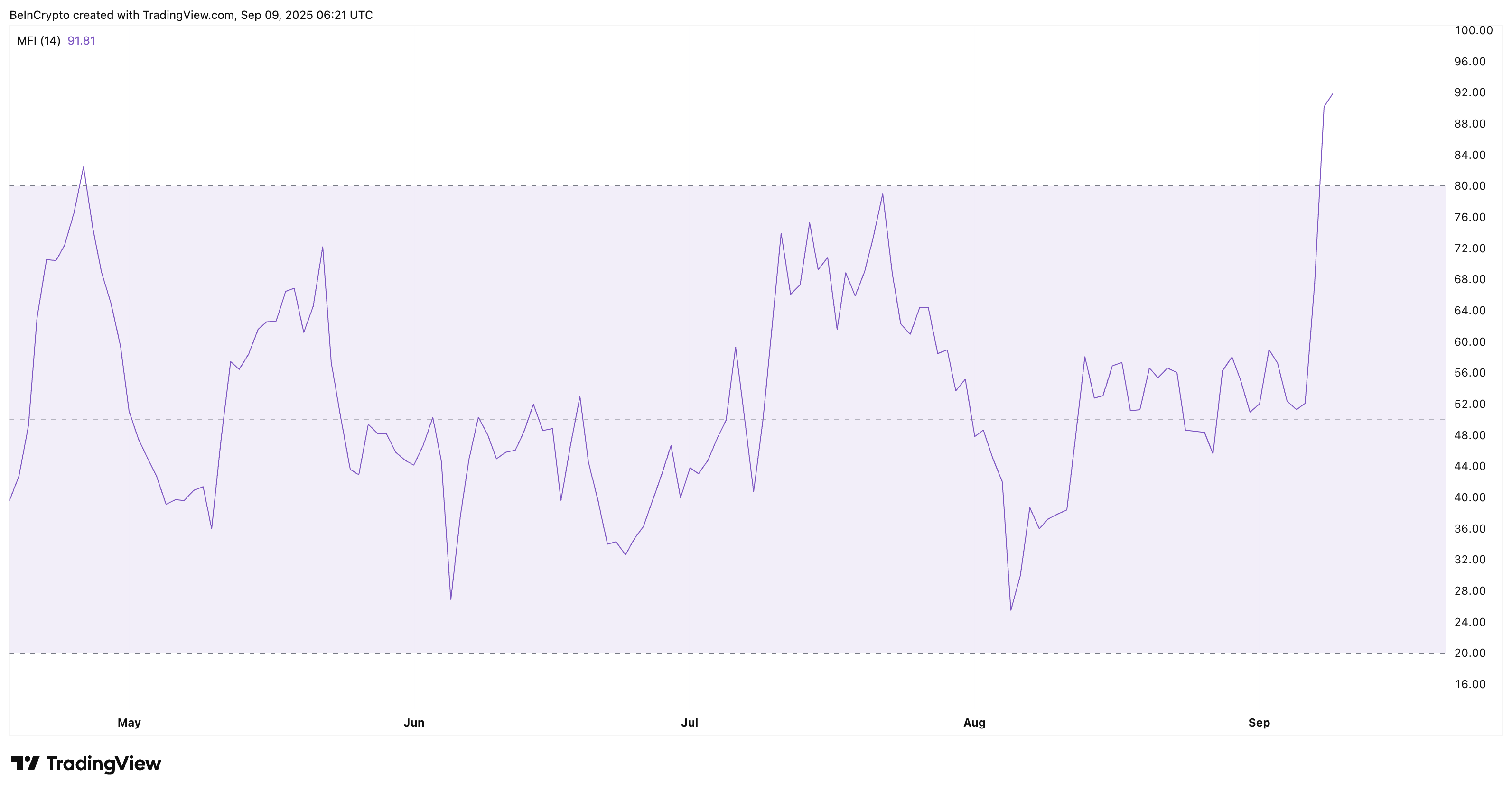 Незважаючи на тиск продажів, попит не відсутній. Індекс грошових потоків (MFI), який відстежує, чи переважає приплив інвестицій, зріс до найвищого рівня з початку 2024 року. Зростання MFI на тлі консолідації цін свідчить про те, що покупці — особливо кити — поглинають кожне невелике падіння.