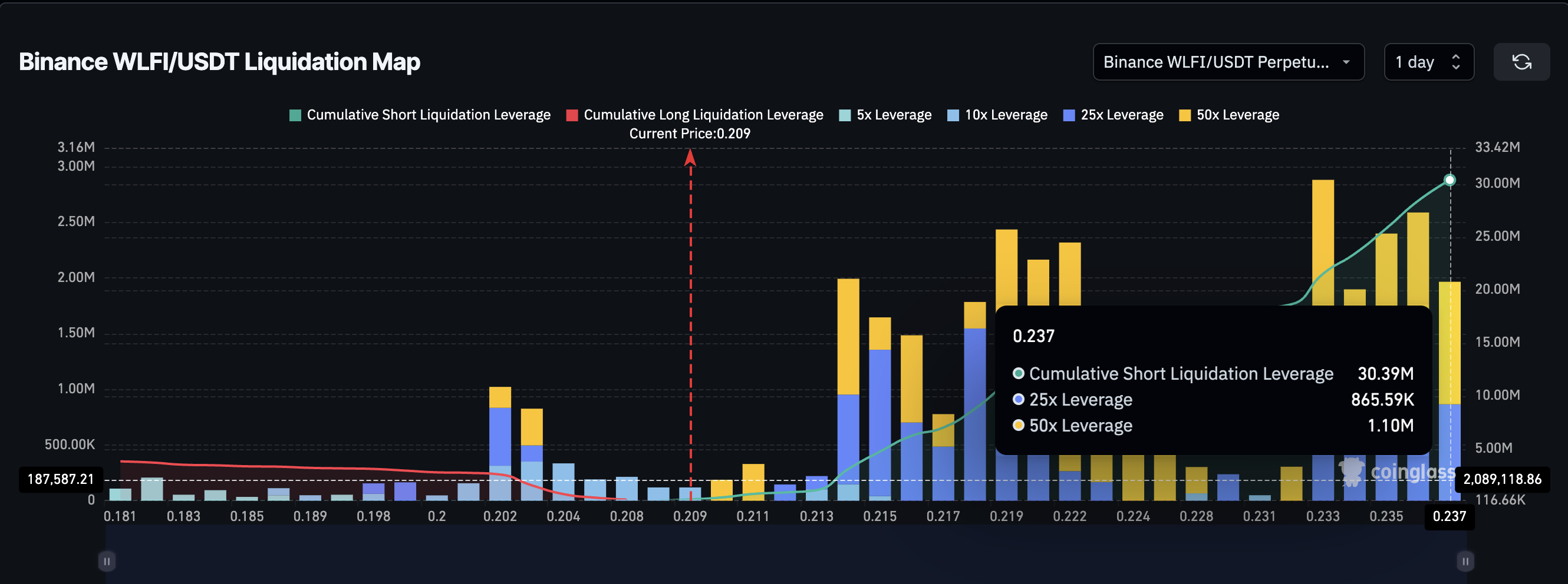 Останній великий ліквідаційний кластер для лонгів знаходиться на рівні 0,18 долара, який зараз є важливою зоною підтримки. Цей рівень стає більш важливим, оскільки він вирівнюється з підтримкою, яка вже видима на графіку ціни.